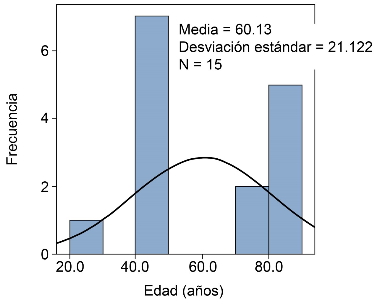 La variable edad se sometió a una prueba de normalidad para determinar la distribución de la misma, la cual resultó ser anormal de acuerdo al test estadístico de U de Mann-Whitney (Figura 1).