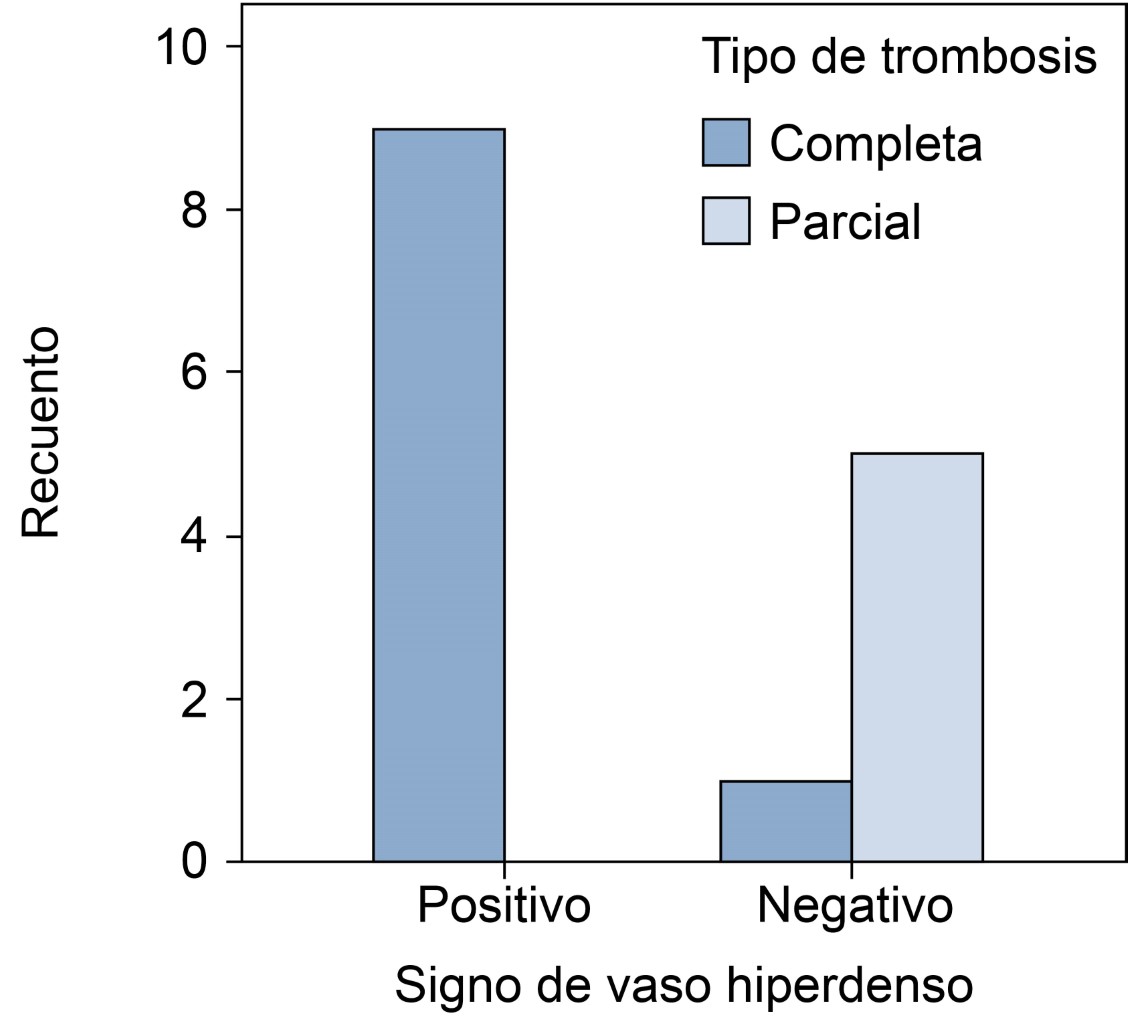 Para la distribución de los casos por tipo de trombosis versus signo de vaso hiperdenso, destaca que el signo de vaso hiperdenso estuvo presente en nueve de los pacientes con diagnóstico de trombosis completa. Fue negativo en cinco de casos, los cuales cursaban con trombosis pulmonar parcial. El paciente restante característicamente dio negativo al signo de vaso hiperdenso; sin embargo, presentaba trombosis pulmonar completa (Figura 2).
