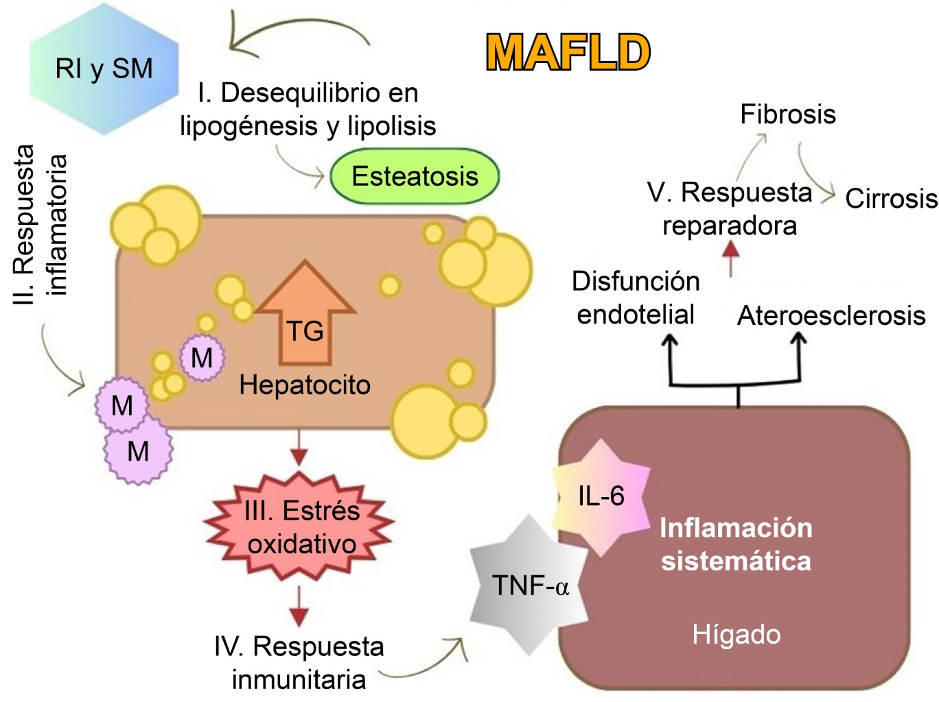 Fisiopatología (Figura 1). La MAFLD comienza por un desequilibrio en la síntesis y eliminación de lípidos en el hígado (lipogénesis y lipólisis), lo que origina una esteatosis a nivel celular, pues se incrementa también la cantidad de triglicéridos dentro de los hepatocitos. Ante esta situación, se desencadena una respuesta inflamatoria, atrayendo células al hígado como los macrófagos, que a su vez liberan sustancias proinflamatorias y generan un estrés oxidativo dentro de las células hepáticas. Posteriormente, se activa una respuesta inmunitaria ante la incapacidad de esta desintoxicación, que resulta agresiva porque se liberan citocinas inflamatorias, siendo el factor de necrosis tumoral alfa (TNF-α) y la interleucina 6 (IL-6) las más importantes, pues afectan la función hepática y conduce a inflamación sistémica, misma que contribuirá a una disfunción endotelial y a la ateroesclerosis.6,7