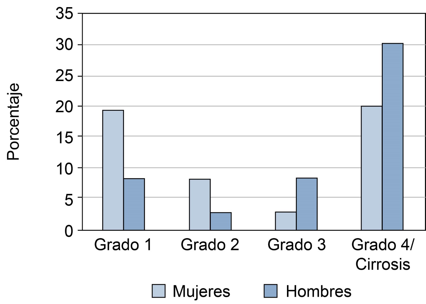 Más de la mitad de los pacientes presentaron algún grado de fibrosis, siendo más prevalente el grado 4 o cirrosis, de la cual hubo mayor prevalencia del patrón mixto. Algunos estudios epidemiológicos sugieren que hay variaciones de género entre las diferentes clasificaciones de gravedad, con una presentación de la enfermedad más avanzada y un curso más agresivo en mujeres que en hombres;18 sin embargo, en el presente estudio se encontró lo opuesto, ya que hubo mayor prevalencia de fibrosis grado 3 y cirrosis en hombres (Figura 3).