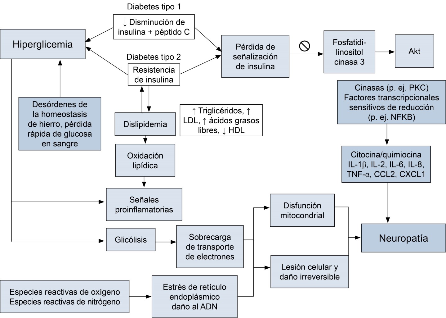 Dentro de la clasificación, la afección a las fibras pequeñas es más común por su vulnerabilidad desde estadios tempranos de la enfermedad. A pesar de que la fisiopatología completa aún es desconocida, se han establecido diferentes modelos para explicar sus mecanismos de manera más completa y encontrar nuevas estrategias terapéuticas.8