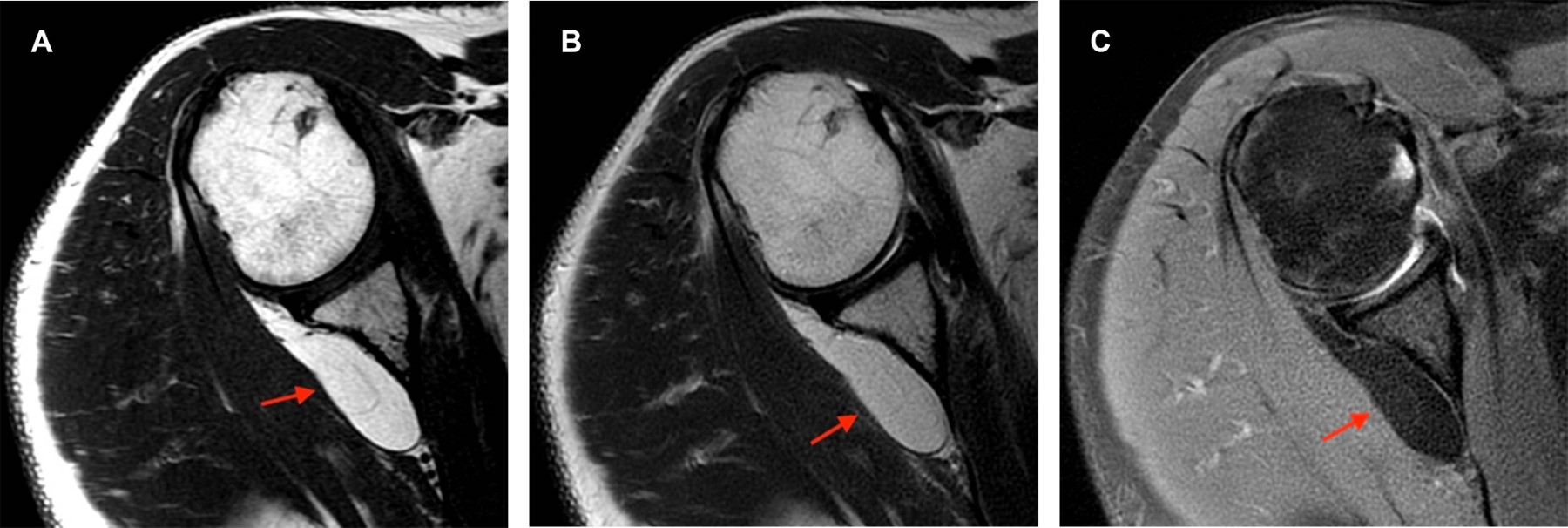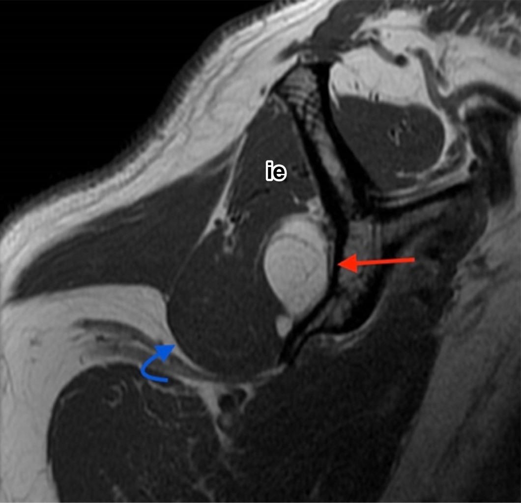 Masculino de 71 años de edad, refiere dolor moderado a intenso en hombro derecho de dos meses de evolución que incrementa al realizar movimientos de abducción y extensión, motivo por el cual se solicita estudio de resonancia magnética simple de hombro derecho. Como único antecedente el paciente refiere accidente en motocicleta hace 50 años con fractura de clavícula derecha recibiendo tratamiento conservador.