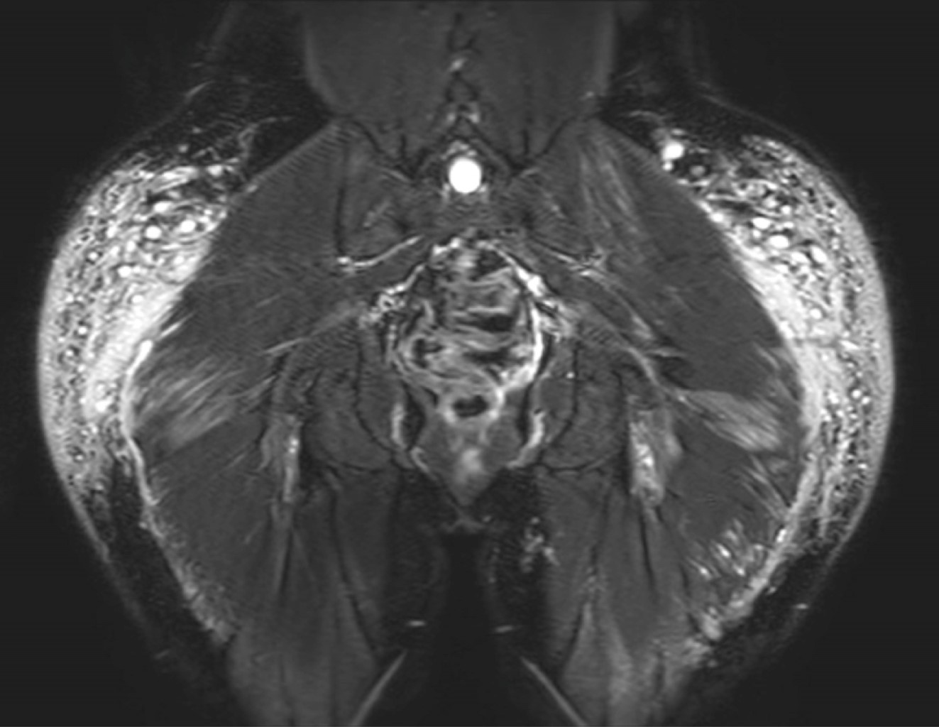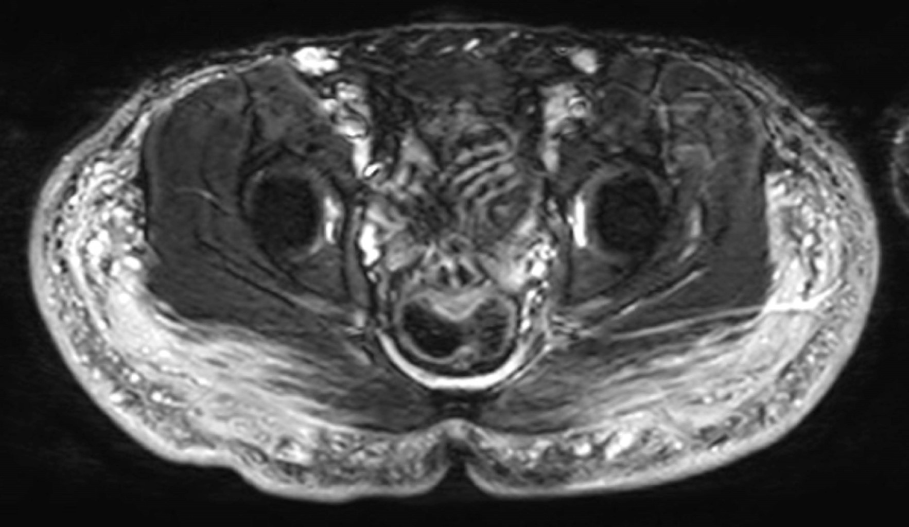 Paciente de 30 años con antecedentes de aplicación de modelantes en las regiones glúteas hace 10 años. Desde hace tres años presenta dolor en ambas piernas, con zonas induradas y cambios de coloración. Se le realizó resonancia magnética de las regiones glúteas y piernas identificando imágenes globulares y lineales irregulares de comportamiento isointenso en el T1, hiperintenso en el T2, hiperintenso en las secuencias de saturación grasa (Fat-Sat) y en STIR (Short Inversion Time Inversion Recovery) con compromiso de los tejidos blandos superficiales y de los planos musculares que afectan a los glúteos mayor y medio (Figuras 1 y 2).