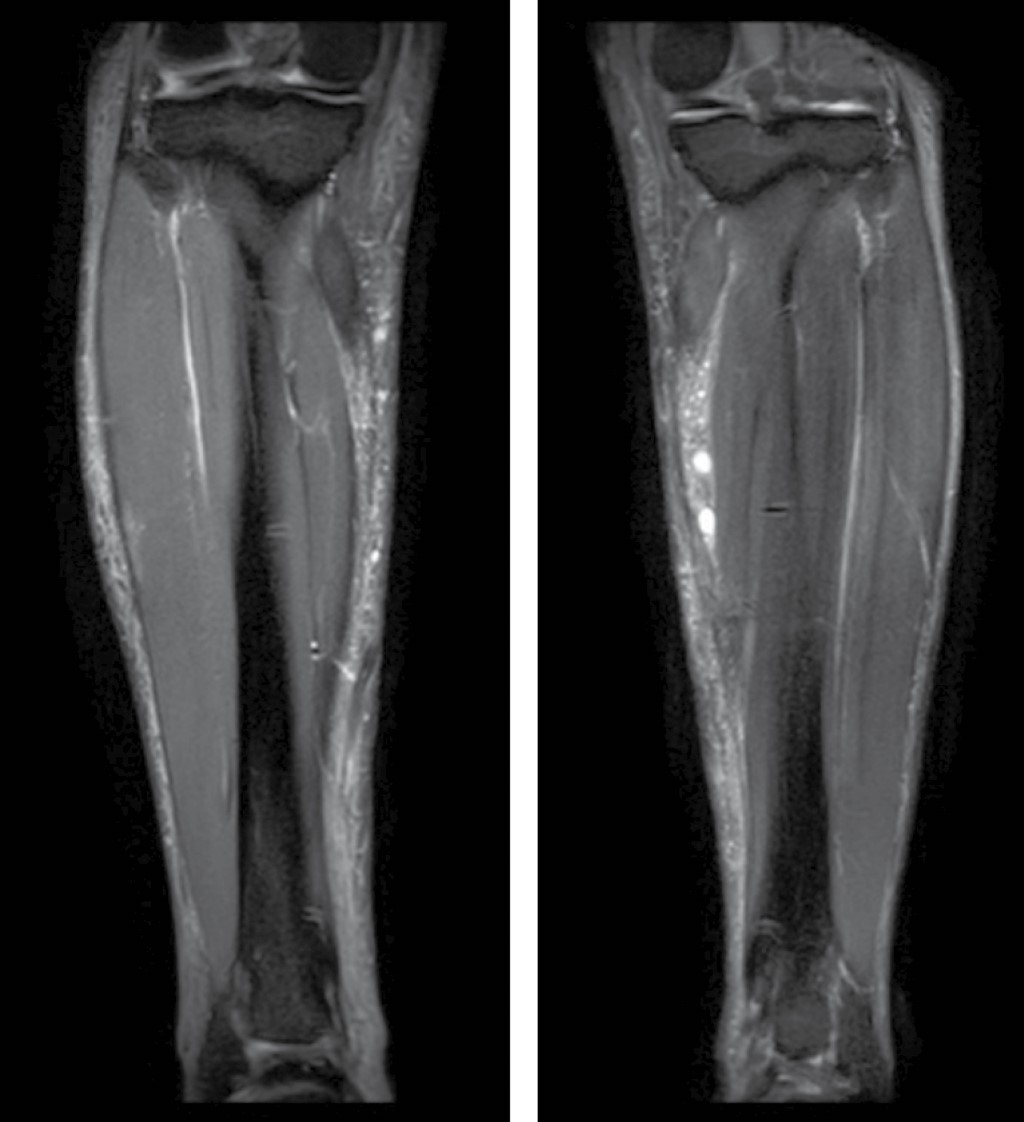 En el estudio de resonancia magnética (RM) de piernas se identificó edema de tejidos blandos superficiales de ambas piernas con depósitos de material modelante en la porción superior del músculo gemelo medial de la pierna derecha y en la pierna izquierda se observa material modelante en toda su longitud sin compromiso de los planos musculares (Figura 3).