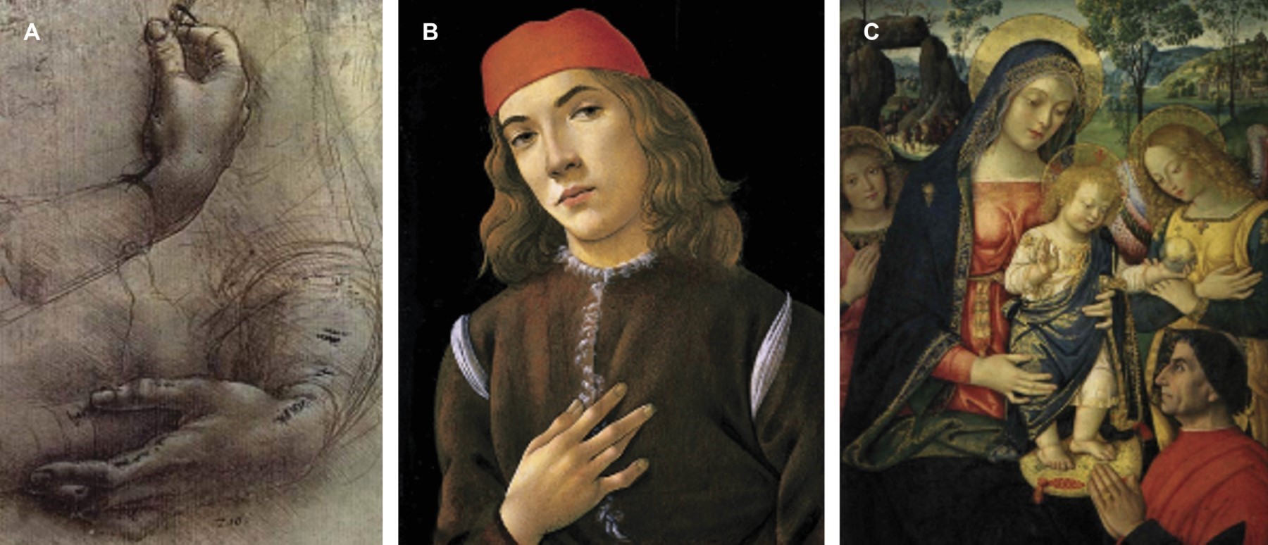 La Revista de la Sociedad Real de Medicina del Reino Unido asoció diversas anomalías de los dedos con pinturas de artistas renacentistas, principalmente italianos.2 De las pinturas más famosas se encuentran el Estudio de manos y brazos de Leonardo Da Vinci (1474) y Retrato de un joven de Sandro Botticelli (1483), representando la flexión de la articulación interfalángica proximal del quinto dedo3 (Figura 1). Algunos autores han formulado diversas hipótesis sobre su manera de representar los dedos; sin embargo, no existen documentos históricos que puedan confirmar la verdadera intención de los pintores, pudiendo ser una tendencia artística, un sello distintivo o un significado religioso.2,4