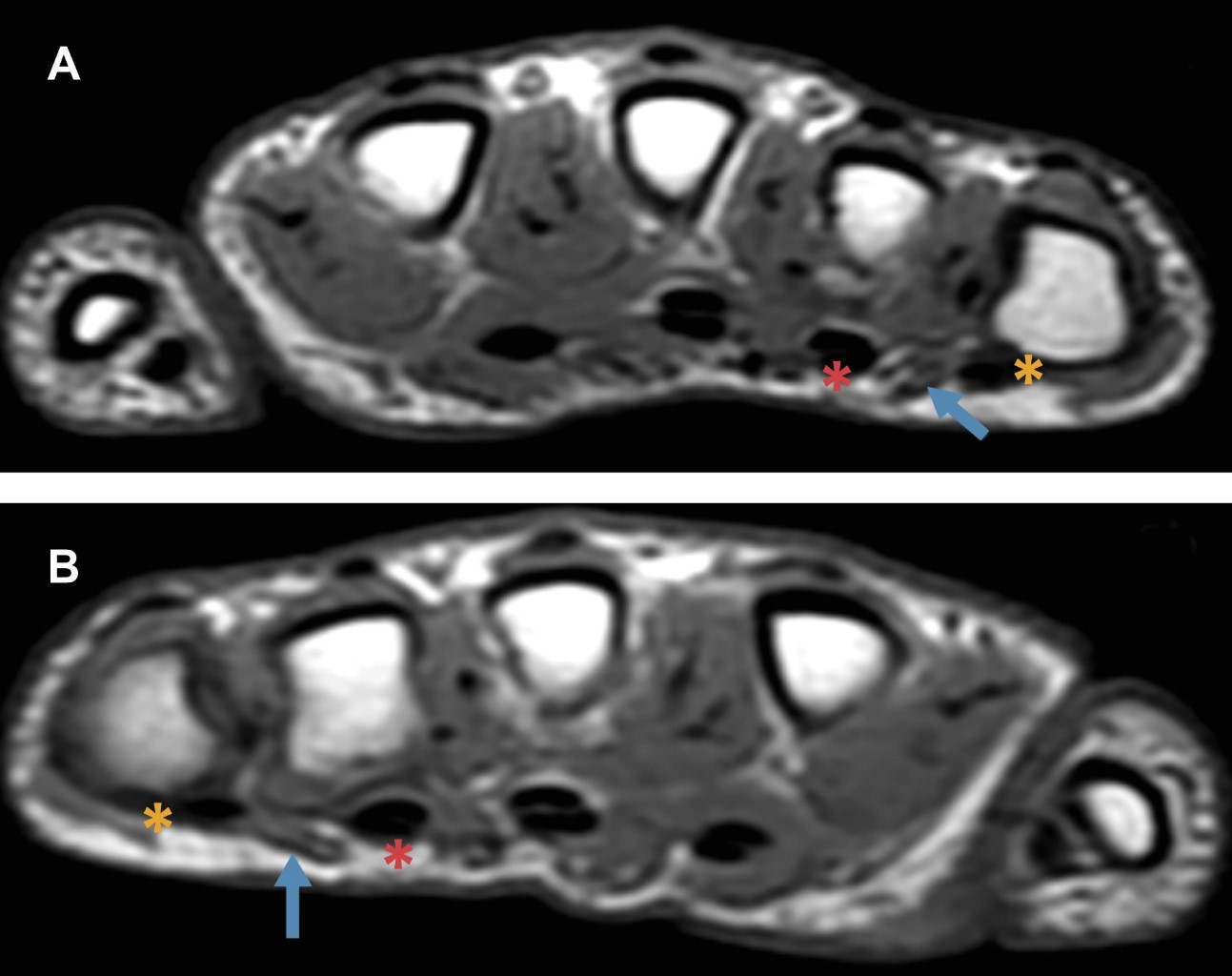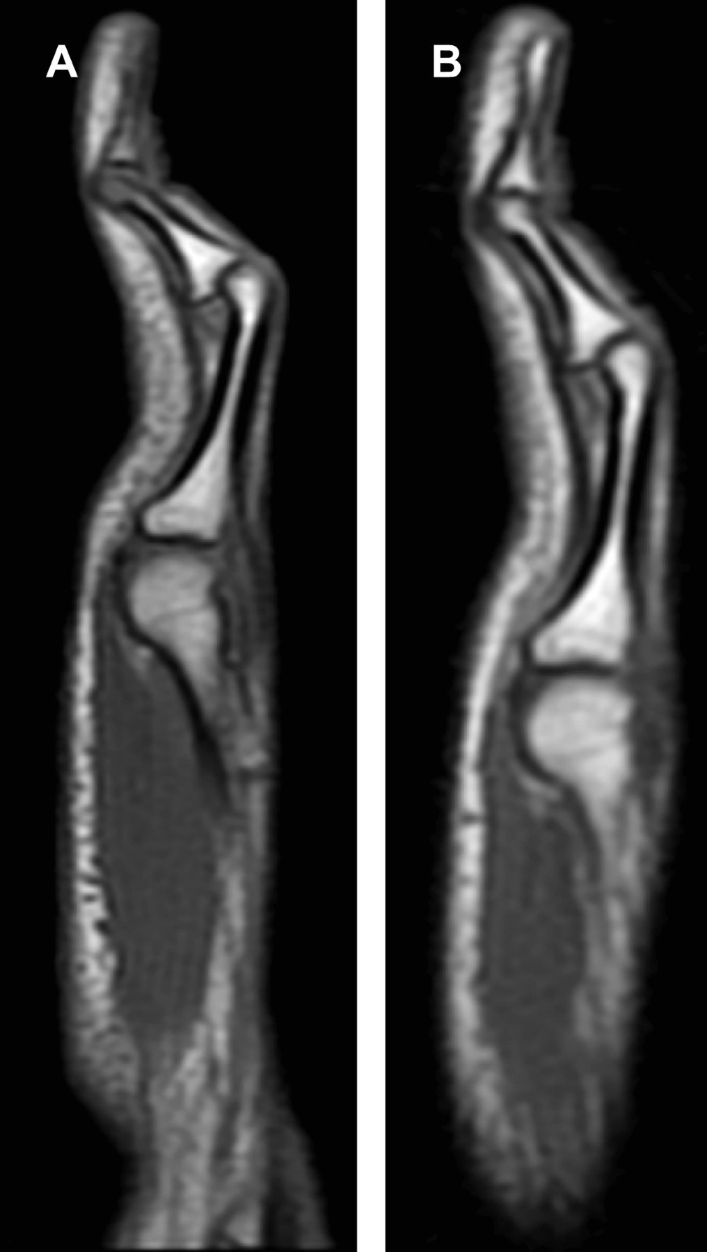 Masculino de 15 años de edad, que presenta deformidad del dedo meñique de ambas manos. No tiene antecedentes de traumatismos, patologías o síndromes congénitos. Nadie más en su familia presentaba dicha morfología en los dedos. En el estudio de resonancia magnética (RM) se observó deformidad del quinto dedo por hiperflexión de la articulación interfalángica proximal en forma bilateral (Figura 2). El vientre muscular del cuarto lumbrical presenta un curso superficial en relación a los tendones flexores superficial y profundo, secundario a una inserción anómala, con disminución en su diámetro en el plano axial (Figura 3). Todos los hallazgos son más evidentes en el dedo meñique de la mano derecha. Las articulaciones interfalángicas distales y metacarpofalángicas presentan hiperextensión compensatoria.