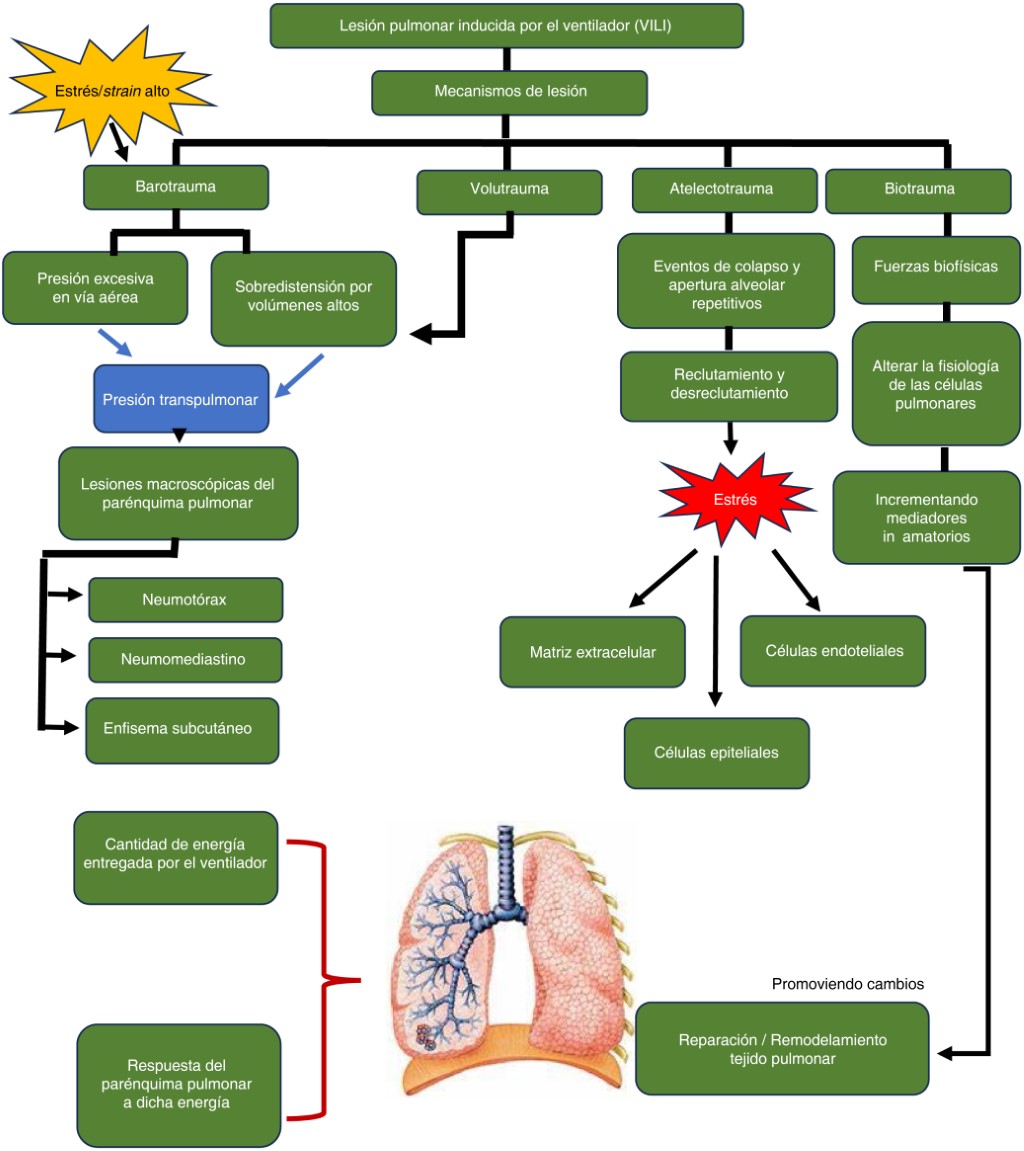 Se han descrito cuatro mecanismos de lesiones pulmonares atribuibles a ventilación mecánica: barotrauma, volutrauma, atelectotrauma y biotrauma; y recientemente se reconoció que la heterogeneidad regional, la frecuencia del estrés y la fuga capilar pulmonar también contribuyen al desarrollo de dicha lesión (Figura 1).6