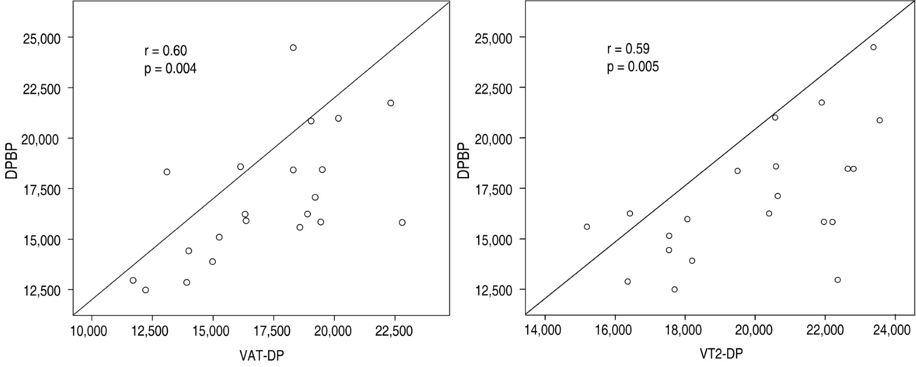 Resultados: se estudiaron 21 pacientes entre 49 y 59 años (14.3% mujeres). Se aplicó el coeficiente de correlación de Spearman y se encontró que existe una fuerte-moderada correlación positiva entre el PQDP y el VAT-DP con significancia estadística (p = 0.004, r = 0.60) y de la misma manera entre PQDP y correlación moderada con VT2-DP (p = 0.005, r = 0.59).