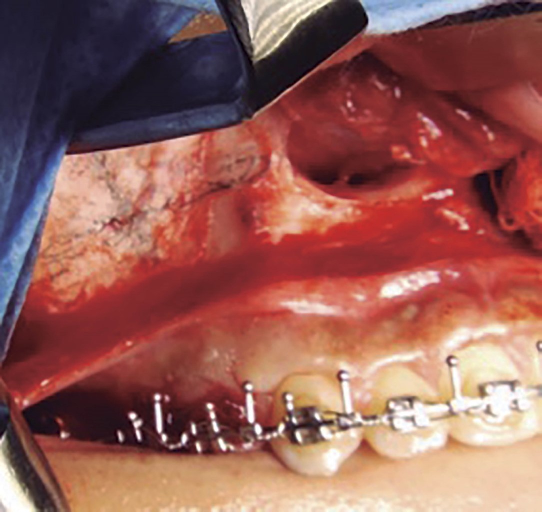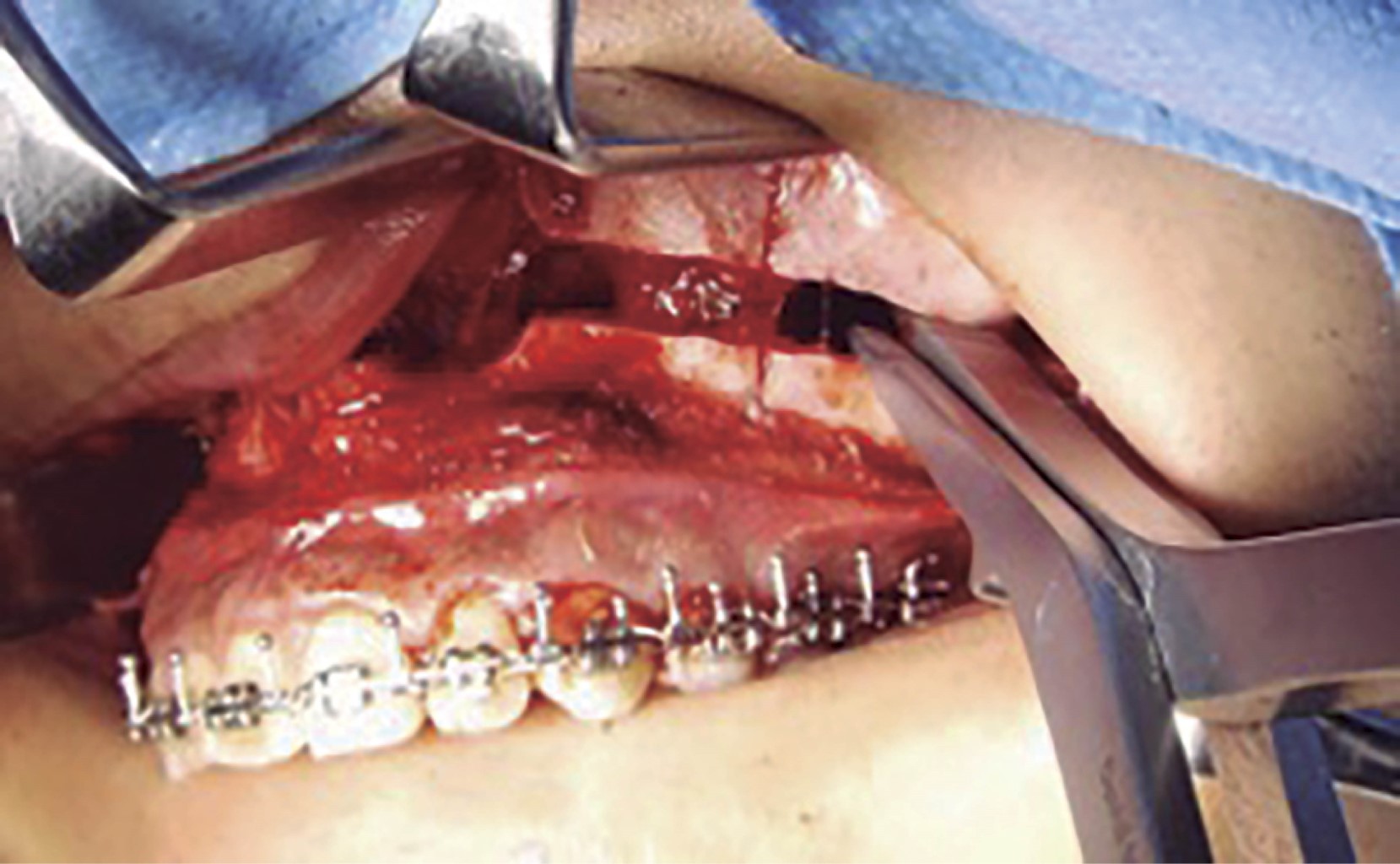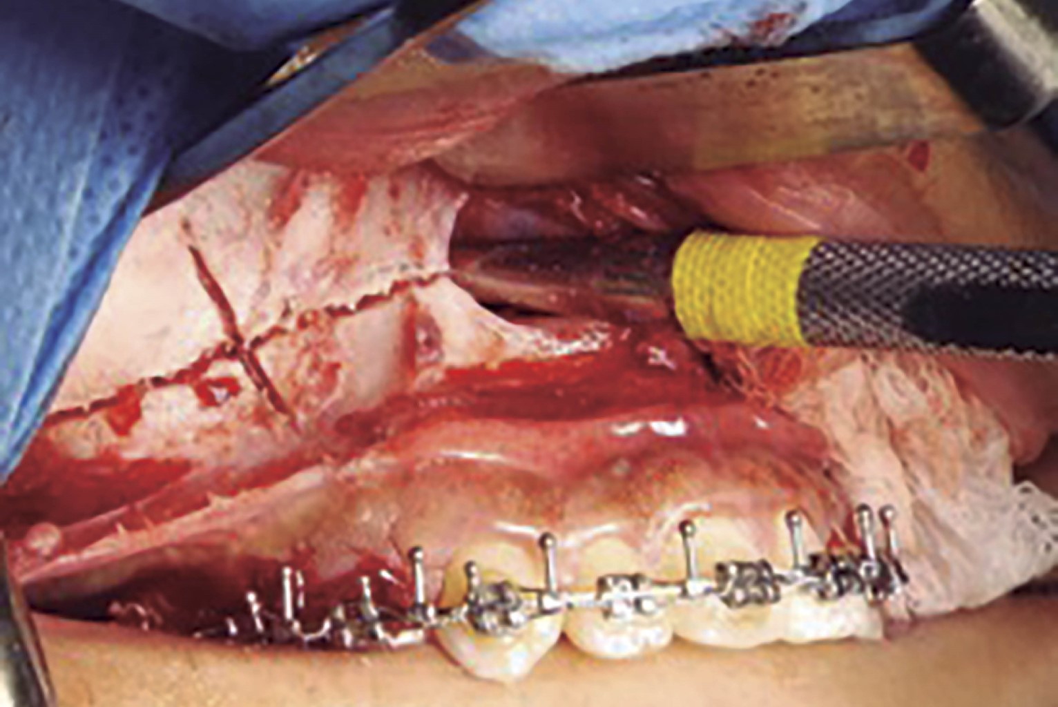 Se realiza monitorización de los signos vitales del paciente, con una tensión arterial sistólica que no debe pasar los 90 mmHg. Mediante anestesia general se realiza intubación nasotraqueal. Previa asepsia y antisepsia con antiséptico se colocan campos estériles. Posteriormente, se realiza taponamiento faríngeo con gasas, así como taponamiento nasal anterior. Se hace marcaje e infiltración de lidocaína con epinefrina en el tejido mucoso a incidir. Se da un lapso de 5 minutos de espera y se procede a realizar incisión circunvestibular de canino a canino con electrocauterio u hoja de bisturí No. 15 de 5 a 8 cm por encima de la unión mucogingival hasta periostio. Se desbrida hasta exponer lecho óseo maxilar, se inicia de anterior a posterior, de la apertura piriforme hacia la región pterigomaxilar en ambos lados. Se localiza nervio infraorbitario de manera bilateral para su protección. La disección en sentido superior debe ser suficiente para colocar, en su momento, las microplacas de osteosíntesis.14-18