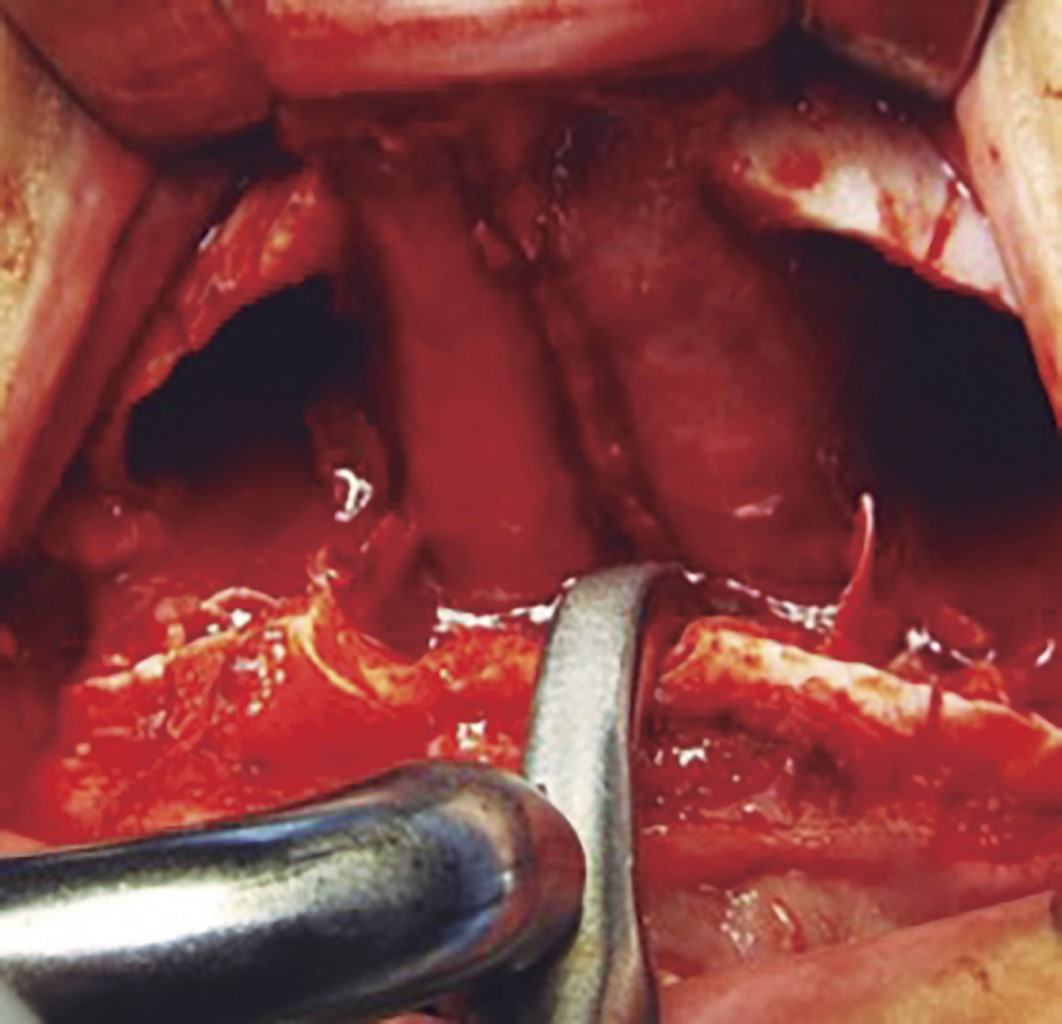 Se procede a la disección de la mucosa nasal. En el piso de la fosa nasal ha de disecarse hasta 30 mm a posterior (Figura 2) y enseguida se efectúa marcaje sobre el lecho óseo de acuerdo al tipo de osteotomía a realizar. Se colocan marcas de referencia (Figura 3). Se realiza osteotomía con sierra reciprocante, iniciando en la pared lateral de la apertura piriforme, protegiendo la mucosa nasal previamente con una legra, hasta la región pterigomaxilar. Una vez completado el corte se realiza la disyunción de las apófisis pterigoides laterales y mediales del seno maxilar mediante osteótomos y se procede a realizar el descenso maxilar introduciendo pinzas de Smith en la osteotomía del buttress maxilomalar (Figura 4), de manera gradual y verificando la integridad de la mucosa nasal. Se realiza este paso de manera bilateral. Se procede a introducir cincel de septum en la apertura piriforme (Figura 5). Se inserta la pinza de Smith en el buttress anterior y de igual forma se abre de manera gradual verificando también la integridad de tejidos blandos. Se completa la disyunción del maxilar y se moviliza en su totalidad: anterior, lateral e inferiormente (Figura 6). Se regularizan espículas, si las hay, y se reposiciona el maxilar de acuerdo a lo planeado para la cirugía. Se fija el maxilar con miniplacas de osteosíntesis en L en la región medial del buttress nasomaxilar y en el buttress cigomaticomaxilar ambos de manera bilateral, se verifica hemostasia y se colocan puntos de sutura en la mucosa maxilar. Se procede a seguir con la cirugía ortognática.2,6,14,15,19