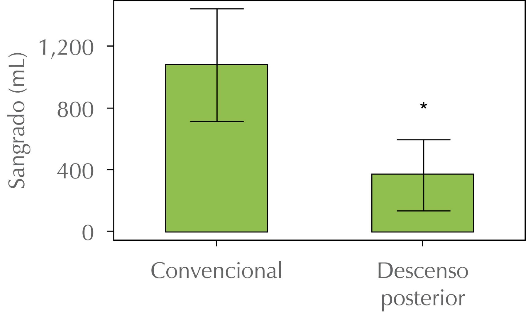 Se comparó la media del sangrado total de ambos grupos, siendo menor para el grupo 2 en relación al grupo 1, 1,075 y 363 mL, respectivamente, lo que indica que hay una reducción significativa del sangrado total con la técnica de descenso posterior (Figura 7).