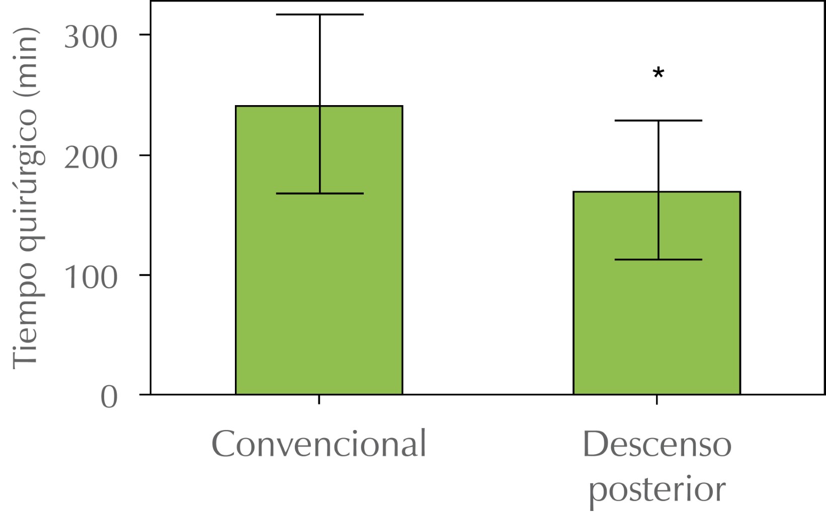Tanto el sangrado y el tiempo quirúrgico fue menor en el grupo de descenso posterior con significancia estadística (p < 0.0001 y < 0.05, respectivamente) (Figura 7 y Tabla 4).