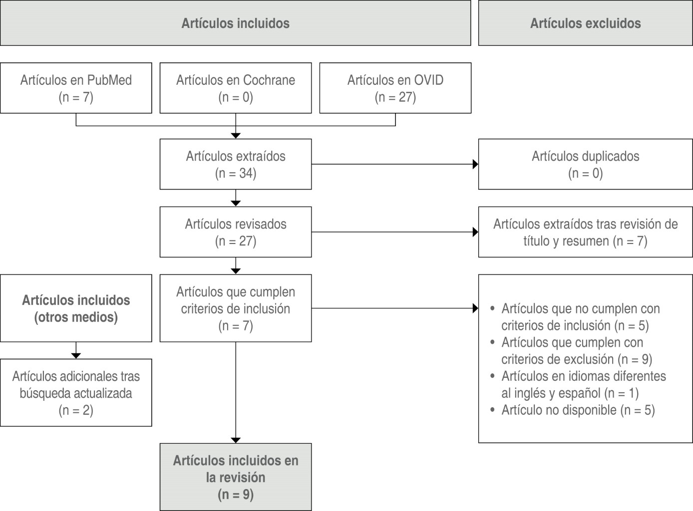 Para realizar la actualización, se llevó a cabo un proceso de búsqueda de literatura y de selección de artículos, utilizando las palabras clave: síndrome medular central, traumático y espondilosis cervical en PubMed, Cochrane y OVID de los últimos cinco años. Los artículos fueron revisados por tres autores independientes con base en los siguientes criterios de inclusión: 1) artículos de revisión, revisiones sistemáticas, cohortes prospectivos y retrospectivos y reportes de casos; 2) descripción del síndrome medular central; 3) asociado a traumatismo; 4) descripción de la relación del síndrome medular central con la presencia de espondilosis cervical; y 5) artículos escritos en inglés o español. Las editoriales, artículos sin texto completo y artículos preaprobados fueron excluidos. Se identificaron 34 artículos, en los cuales se incluyeron dos artículos extraídos de otros medios, abarcando un total de nueve artículos para la revisión bibliográfica de esta serie de casos (Figura 2).