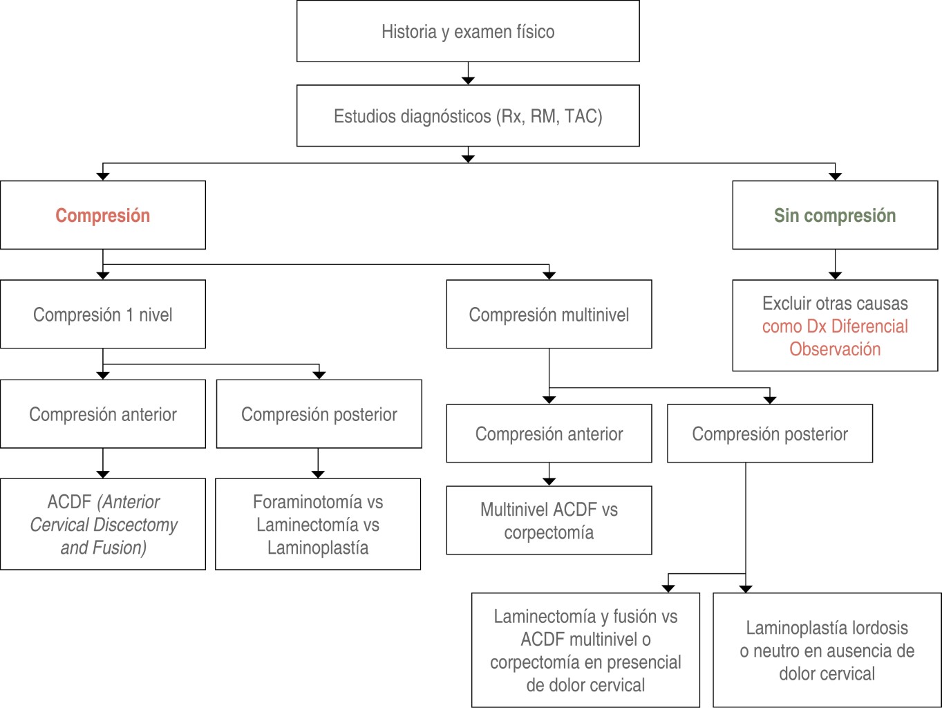 La decisión quirúrgica al momento de decidir realizar una cirugía, deberá tomar en cuenta tres factores importantes: a) donde se encuentra la compresión (anterior-posterior); b) si son uno o varios niveles; y c) persistencia de la lordosis.