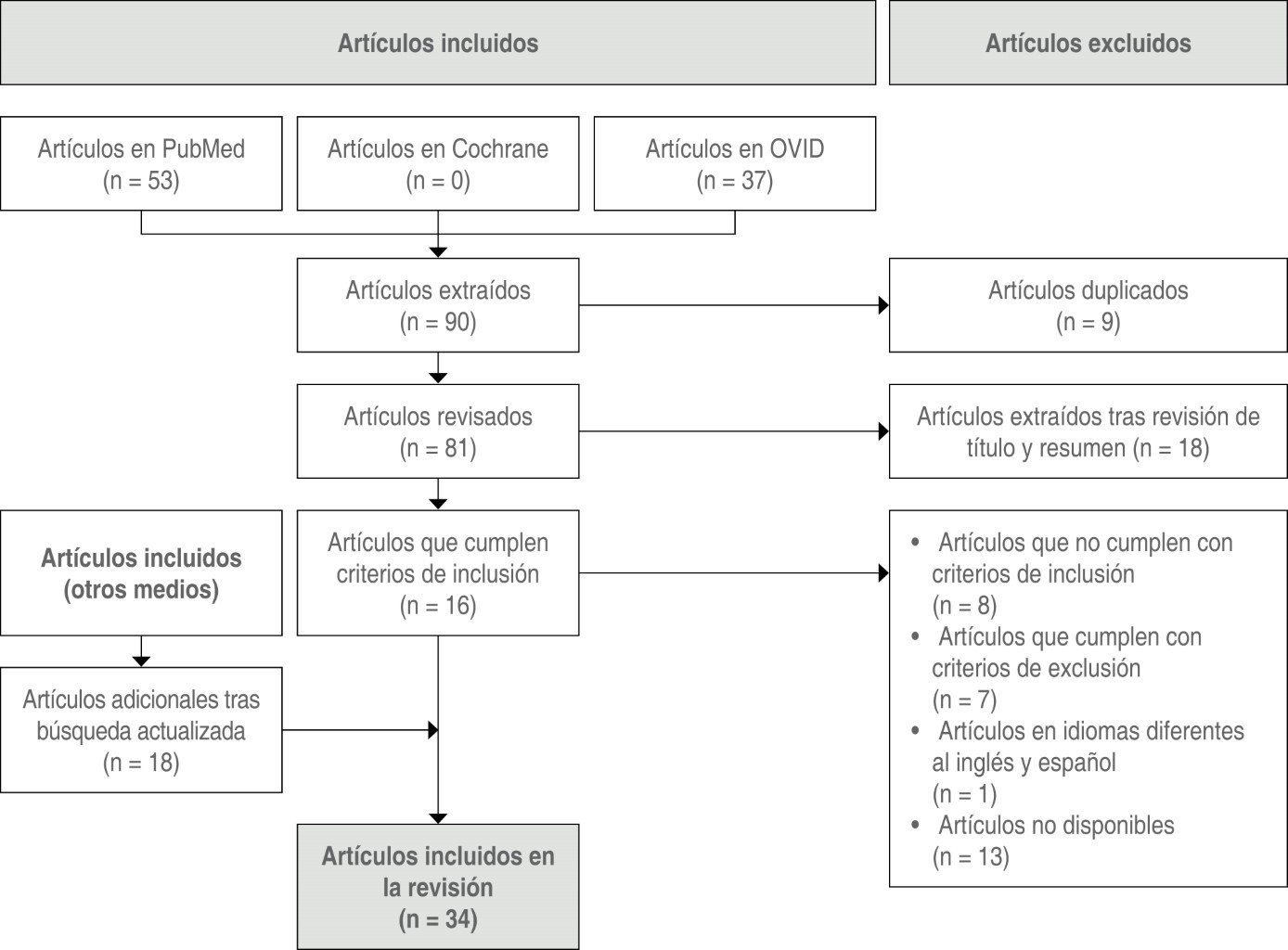 Se especifica el proceso de búsqueda de literatura y de selección de artículos, habiendo realizado una búsqueda con las palabras clave: síndrome cadera-columna, diagnóstico y tratamiento en PubMed, Cochrane y OVID desde 1983 hasta la actualidad (fecha de búsqueda de literatura: 09/06/24). Los artículos fueron revisados por tres autores independientes con base en los siguientes criterios de inclusión: 1) artículos de revisión, revisiones sistemáticas, cohortes prospectivos y retrospectivos y reportes de casos; 2) descripción del síndrome de cadera-columna; 3) abordaje diagnóstico del síndrome de cadera columna; y 4) tratamiento del síndrome de cadera-columna. Los editoriales, artículos sin texto completo y artículos preaprobados fueron excluidos. Se identificaron 16 artículos, a los cuales se incluyeron 18 artículos extraídos de otros medios, abarcando un total de 34 artículos para esta revisión bibliográfica (Figura 1).