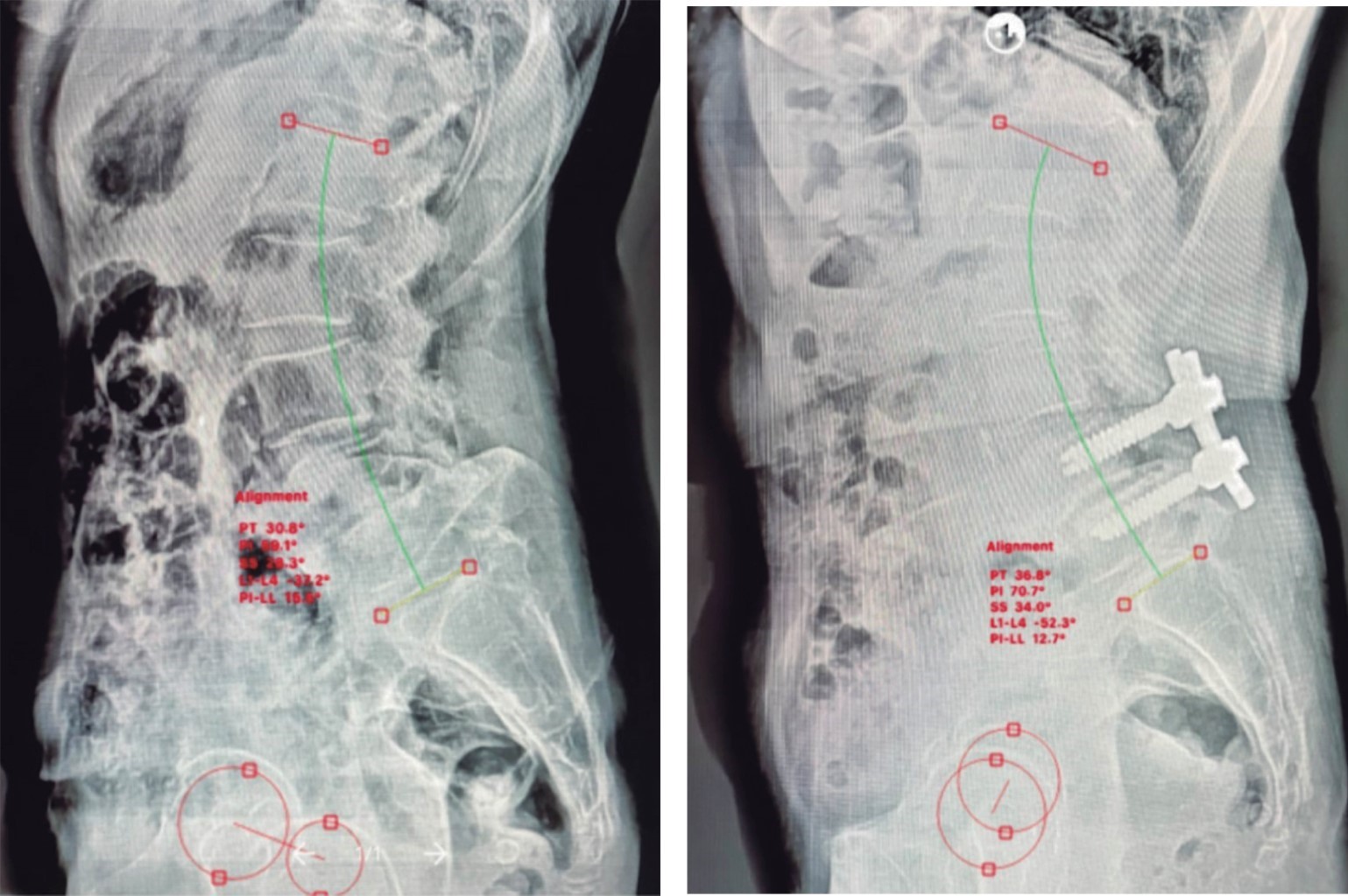 Se debe intervenir primero la cadera si presenta contractura en flexión y en general se ha recomendado iniciar con la ATC,29 se tienen datos que apoyan el basar las mediciones y planeación de la colocación del componente acetabular con ayuda de los parámetros espino-pélvicos estáticos ya que no se modifican postquirúrgicamente en la ATC.17 Para mayor especificidad sobre la colocación, especialmente del componente acetabular que es el de mayor tasa de complicación en estos pacientes, se sugiere revisar el trabajo de Pizones y colaboradores en 202029 o Ramkumar en 2023.30