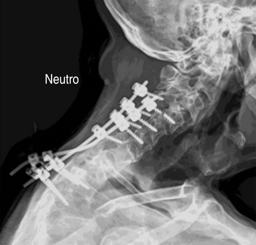 Se admitió hombre de 59 años de edad con diagnóstico de neurofibromatosis tipo 2 para tratamiento quirúrgico de deformidad iatrogénica de la columna cervical, consecuencia de un tratamiento previo realizado en otro servicio (Figura 1). A la admisión, el paciente presentaba una deformidad cifótica de la columna cervical con fallo del sistema de fijación utilizado, con exposición del material de fijación y signos de infección en el sitio operado.