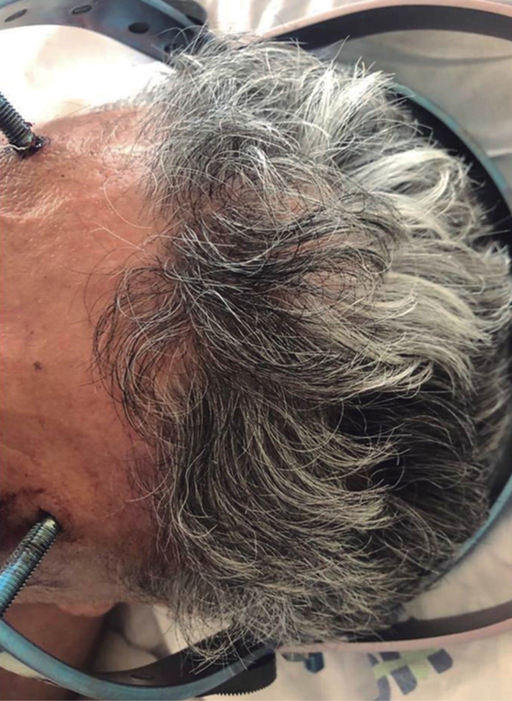 Se propuso la tracción con halo gravitacional para la corrección gradual de la deformidad y se instaló el halo craneal en la primera etapa del tratamiento quirúrgico junto con la instalación de los nuevos implantes, desbridamiento y retirada de los implantes expuestos (Figura 2).