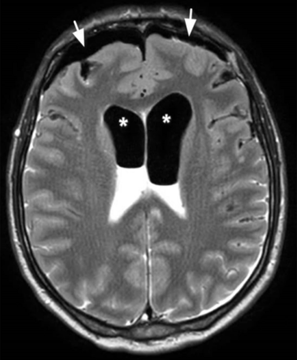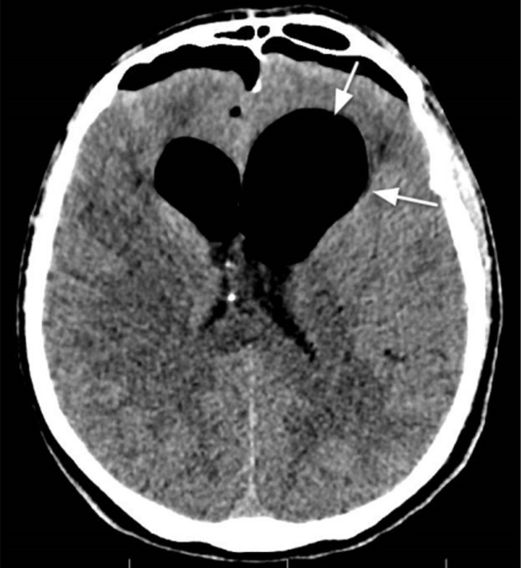 En el tercer día postoperatorio, el paciente presentó vómitos, cefalea, confusión mental y disminución del nivel de conciencia. La tomografía computarizada mostraba edema adyacente al lugar de inserción del tornillo frontal izquierdo, sin alteraciones en el parénquima encefálico o los ventrículos (Figura 3). El examen del líquido cefalorraquídeo mostraba signos sugestivos de proceso infeccioso (aumento de glucosa y proteínas). Se inició antibioticoterapia considerando la hipótesis diagnóstica de meningitis. El paciente mantuvo deterioro del nivel de conciencia. La exploración complementaria con resonancia magnética realizada después de once días mostró neumoencéfalo bilateral en la región frontal y en los ventrículos laterales (Figura 4). Diecisiete días después de la retirada del halo craneal, se realizó una tomografía computarizada que evidenció neumoencéfalo y neumoventrículo con signos de tensión y dilatación de los ventrículos laterales (Figura 5).