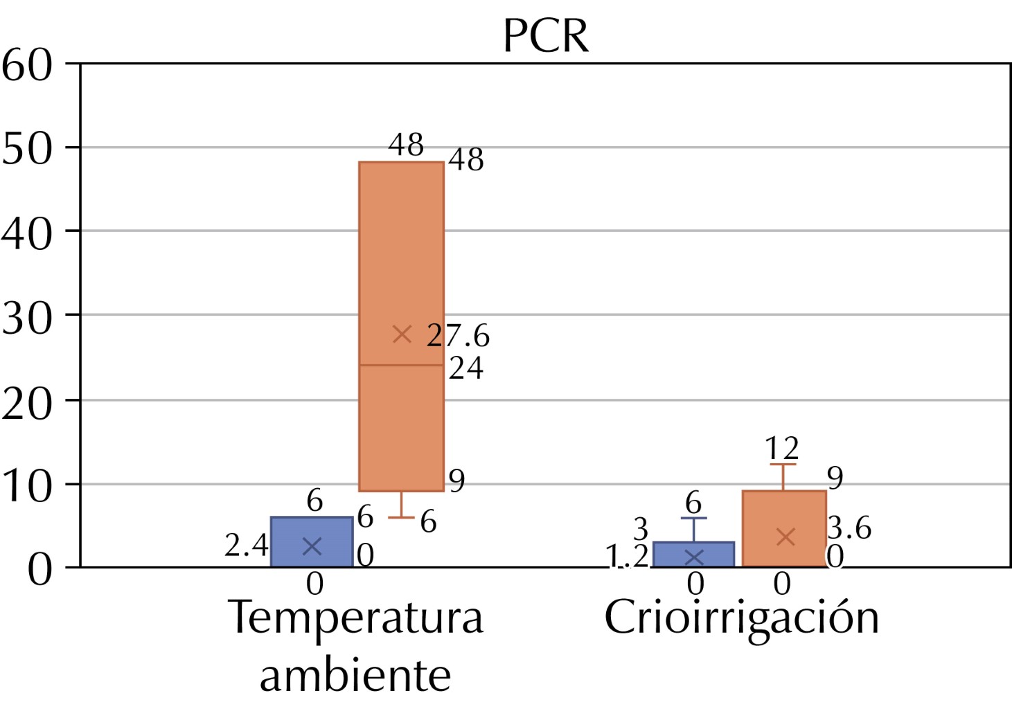 Inicialmente, la media de PCR fue < 6mg/L con una desviación estándar de 0 mg/L. la medición postoperatoria reveló un aumento en la media de 9 mg/L con una desviación estándar de 2.73 mg/L en el grupo de irrigación con solución a 4 °C. En comparación, al grupo control con irrigación a temperatura ambiente, la media inicial de PCR fue de 6.6 mg/L con una desviación estándar de 0.4 mg/L, y la media posterior fue de 27.6 mg/L con una desviación estándar de 17.63 mg/L (Figura 1).