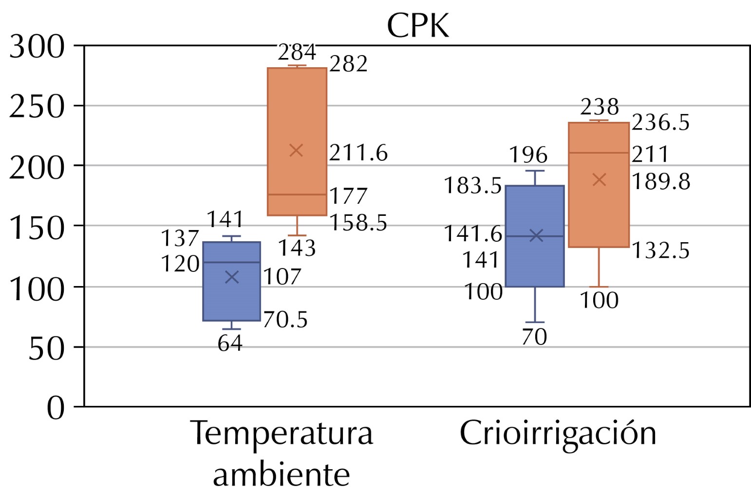 En la evaluación del CPK utilizando crioirrigación, se observó una media inicial de 141.6 U/L, con una desviación estándar de 42.75 U/L. Posteriormente, esta media aumentó a 189.8 U/L, con una desviación estándar de 51.94 U/L. En contraste al grupo control que fue sometido a CPK a temperatura ambiente, la media inicial fue de 107 U/L, con una desviación estándar de 33.94 U/L, mientras que la media posterior fue de 211.6 U/L, con una desviación estándar de 58.74 U/L (Figura 2).