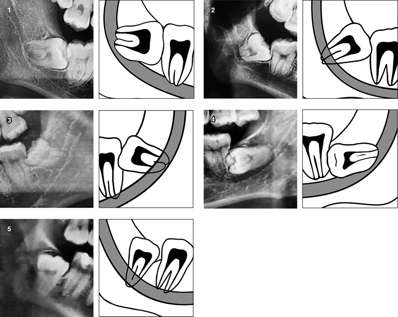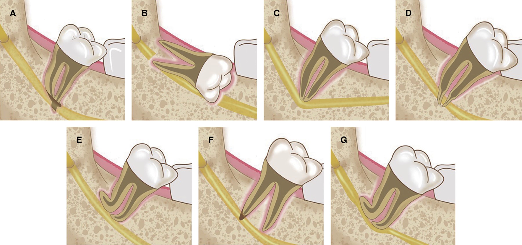 Los principales factores de riesgo son la experiencia del cirujano, la proximidad anatómica del tercer molar inferior con el nervio alveolar inferior, el trauma quirúrgico excesivo, la exposición y manipulación transoperatoria del nervio alveolar inferior o lingual, el grado de retención o impactación del tercer molar, las inyecciones de anestesia local, el diseño del abordaje, la manipulación de los tejidos blandos, el uso inadecuado de instrumentos, el tratamiento del alveolo remanente y la técnica de sutura.11,12 Además, Rood y Shehab describieron múltiples signos radiográficos de proximidad entre el tercer molar y el conducto alveolar inferior, donde los signos de oscurecimiento de las raíces, interrupción de la línea blanca y la desviación del conducto alveolar inferior indicaron una relación estrecha y pueden pronosticar una lesión nerviosa postoperatoria13,14 (Figura 1).