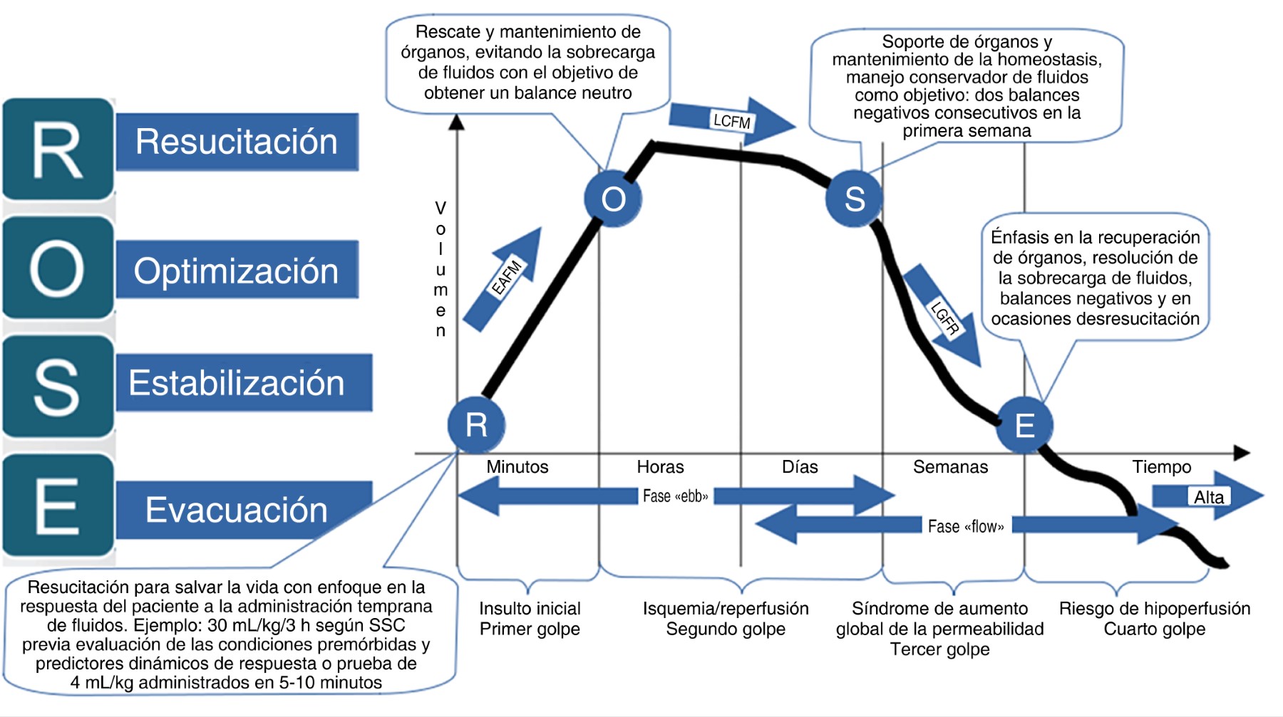 El concepto ROSE8,9 consta de una fase de resucitación enfocándose en el rescate de pacientes; otra de optimización para evitar la sobrecarga de fluidos; fase de estabilización: manipulación conservadora de fluidos, soporte de órganos, mantenimiento de la homeostasis; y la de evacuación que tiene como objetivo la recuperación de órganos y resolución de la sobrecarga de líquidos.