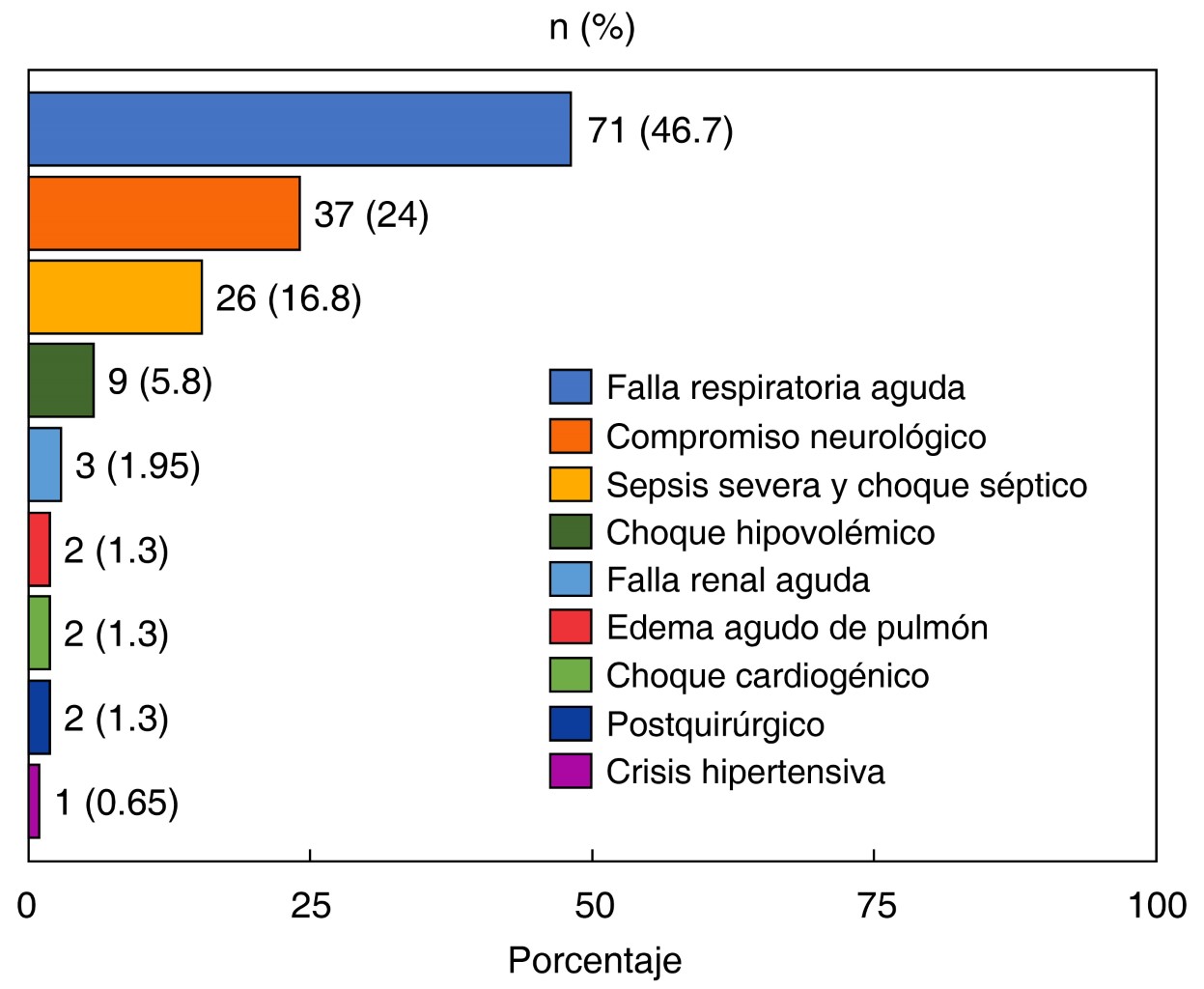 Al analizar las causas de admisión a UCI, encontramos tres situaciones clínicas muy importantes y que explican 87.5% de todos los ingresos a UCI. La insuficiencia respiratoria aguda (46.7%), el compromiso neurológico (24%), y la sepsis severa con choque (16.8%). Estas tres situaciones clínicas se repiten en la mayoría de las series publicadas en la literatura.5,13,19,20