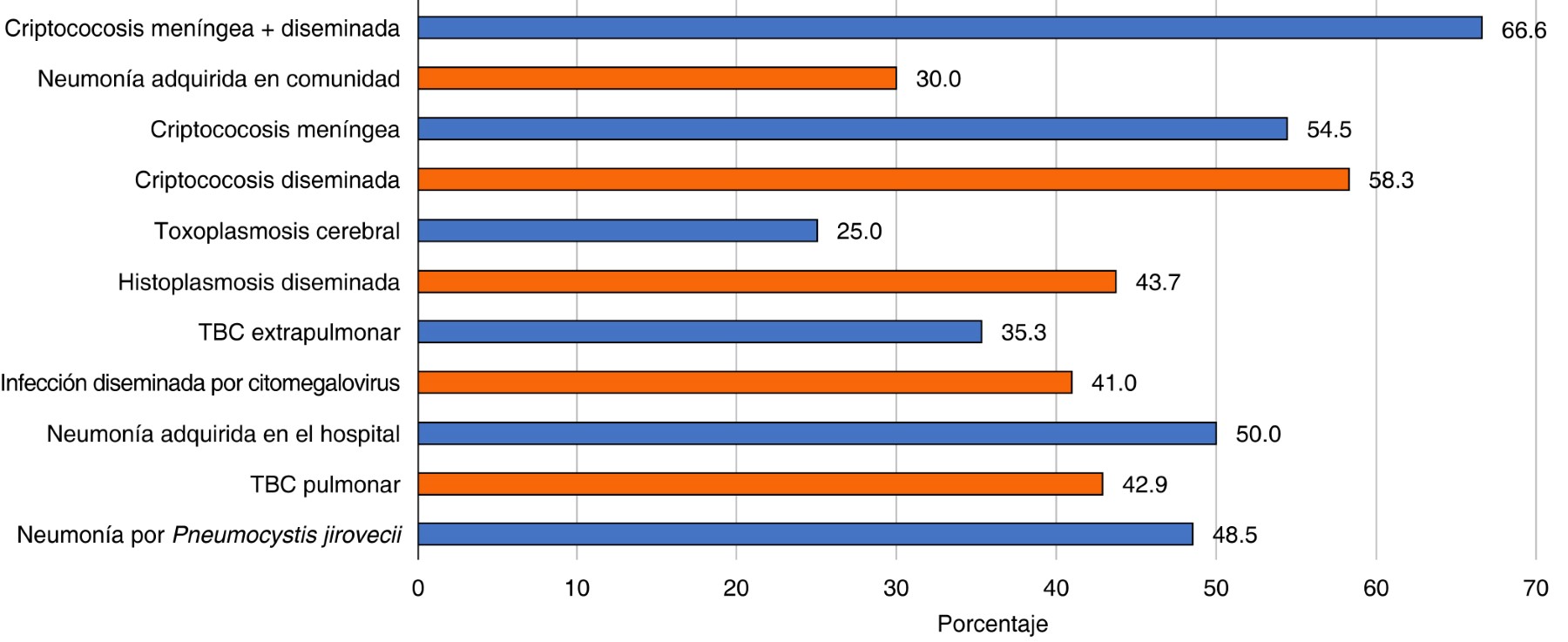 Durante la estancia en UCI, se documentaron varios tipos de infecciones oportunistas (IO) que incluyeron: neumonía por Pneumocystis jirovecii (21.4%), TBC pulmonar (18.2%), infección diseminada por Citomegalovirus (14.3%), TBC extrapulmonar (11%), histoplasmosis diseminada (10.4%), toxoplasmosis cerebral (10.4%), criptococosis diseminada (7.8%), criptococosis meníngea (7.2%), criptococosis meníngea + diseminada (3.9%). Adicionalmente, neumonía adquirida en el hospital (NAH) se presentó en 15.6% y neumonía adquirida en comunidad (NAC) en 6.5%. La Figura 2 muestra la mortalidad asociada a cada una de estas infecciones en los pacientes con VIH ingresados a UCI. Las infecciones que presentaron una mayor tasa de mortalidad en este grupo de pacientes fueron: infección por Cryptococcus neoformans diseminada (58.3%) o del sistema nervioso central (54.5%) o combinada (66.6%); en conjunto con neumonía adquirida en el hospital (30%), neumonía por Pneumocystis jirovecii (48.5%) e histoplasmosis diseminada (43.7%).