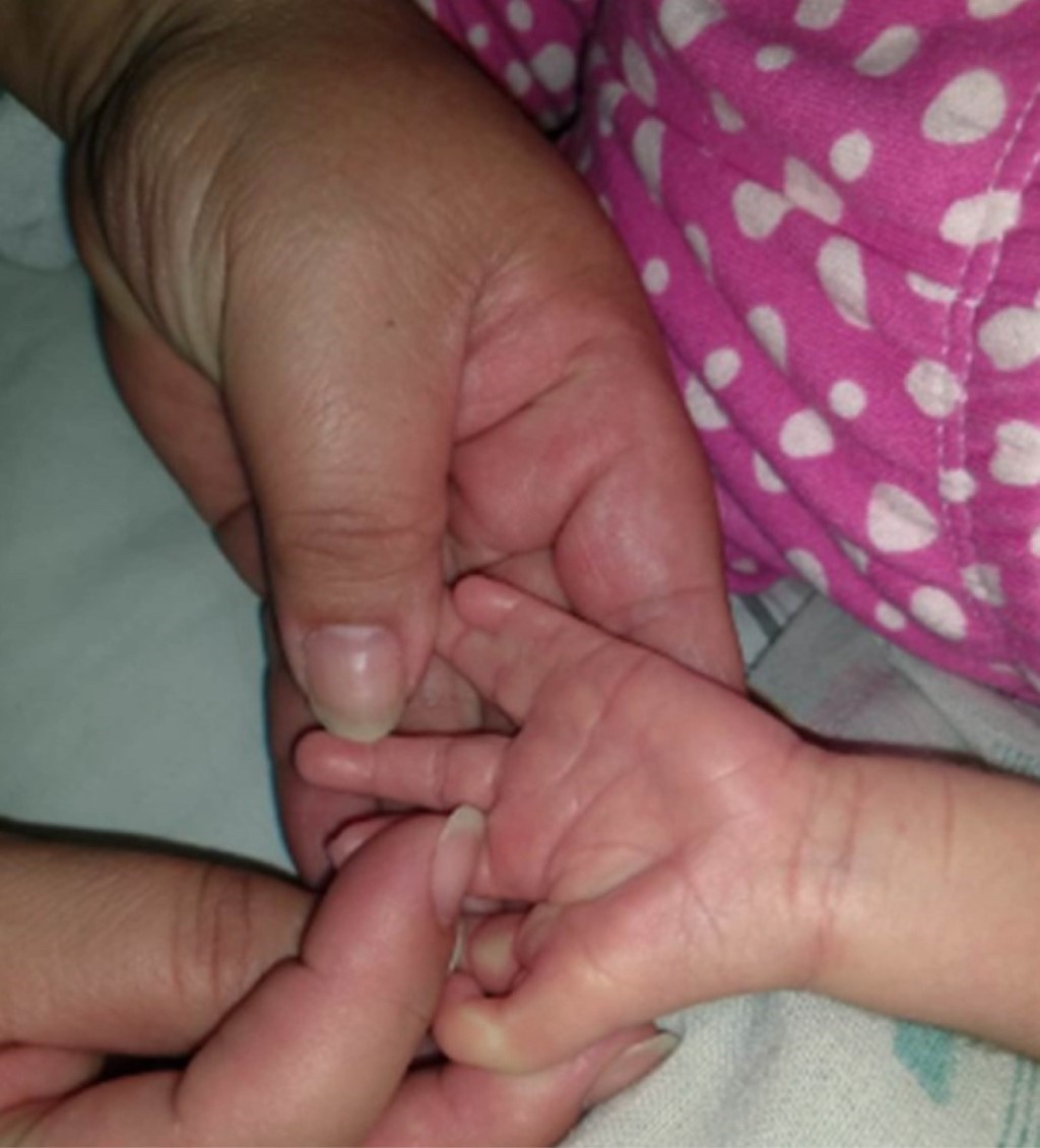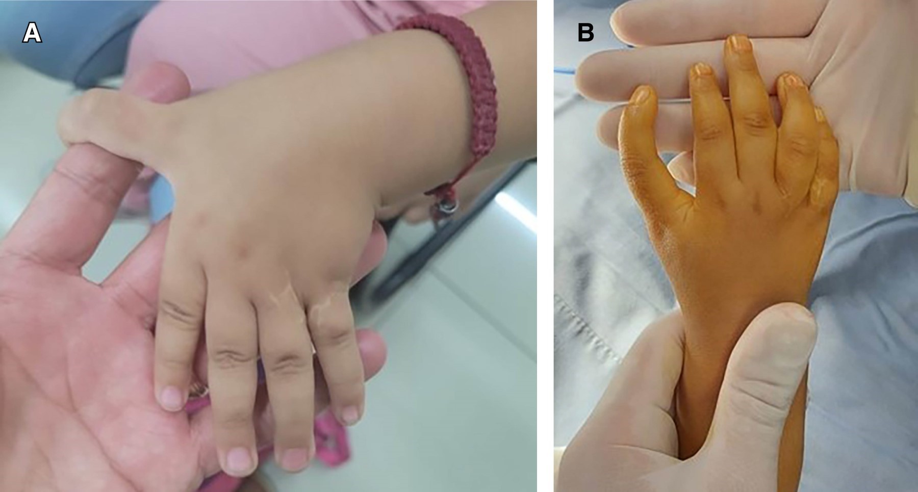 La polidactilia radial engloba un grupo amplio de malformaciones congénitas del pulgar, siendo la segunda malformación congénita más frecuente de la mano, con una incidencia de 1 en 3,000 nacidos vivos.1 La primera clasificación de esta malformación congénita fue realizada por Wassel y colegas en el año de 1962, posterior al estudio de 70 casos de polidactilia radial donde se realizó una clasificación basada en el nivel de duplicación del pulgar. Después Wood y asociados2 y Miura T y colaboradores 1,3 realizaron descripciones de polidactilias complejas asociadas a pulgares trifalángicos. En 2007 se realizó un sistema de clasificación incluyendo todas las descripciones con un total de 121 polidactilias radiales, en la cual observamos que el tipo VII B, la cual se define como una polidactilia radial trifalángica en ambos dedos a nivel de metacarpiano, representa 4% de este tipo de malformaciones.4 Dicha malformación también puede ser valorada por el sistema de clasificación de Oberg-Manske-Tonkin (OMT) la cual permite que las anomalías congénitas de las extremidades superiores se registren bajo sus diagnósticos específicos, la polidactilia radial se incluye dentro de los patrones en la diferenciación anormal del eje correspondiente al tipo B, en la subclasificación II del eje radiocubital anteroposterior.5,6 En una serie de 187 manos con pulgares trifalángicos, 62% de los pacientes presentaban asociación con polidactilia radial,7 la presentación bilateral de dicha deformidad es muy poco común, en la literatura se encuentra un reporte de un paciente masculino con presencia de pulgar trifalángico duplicado bilateral, el cual presenta asociación con labio hendido.8
