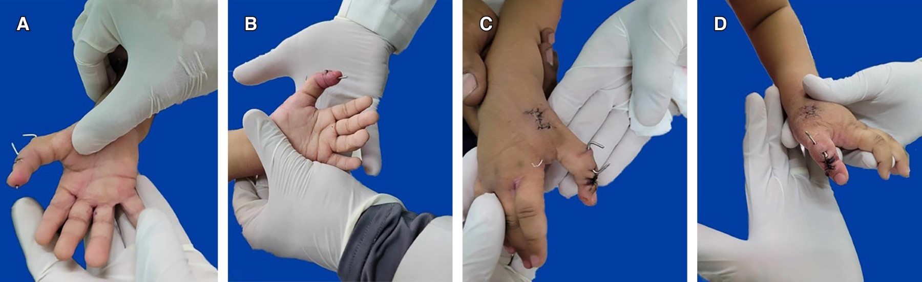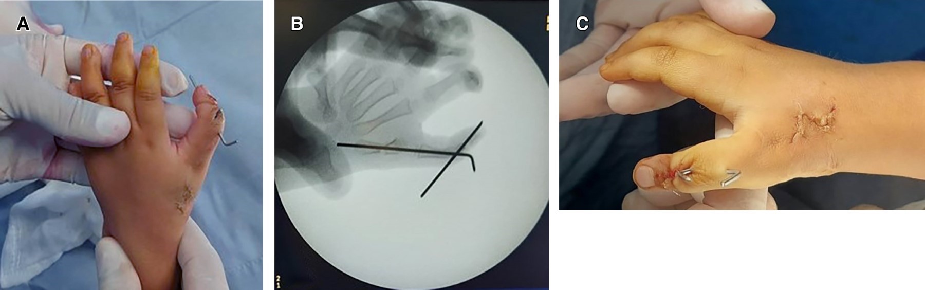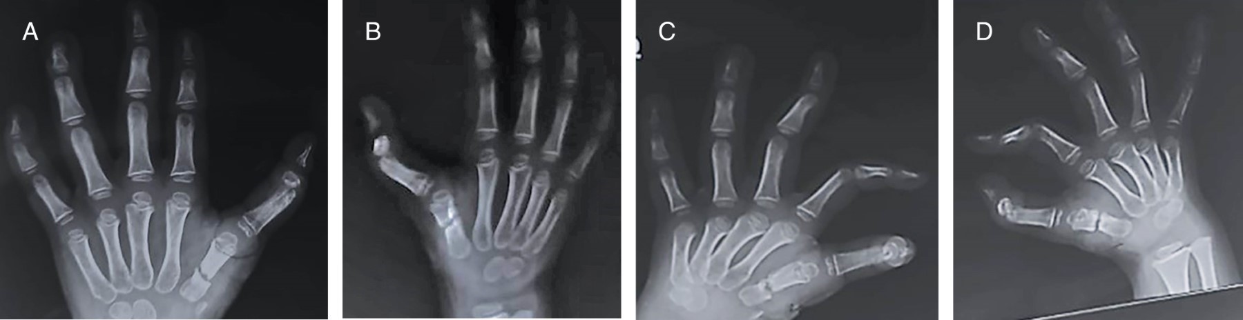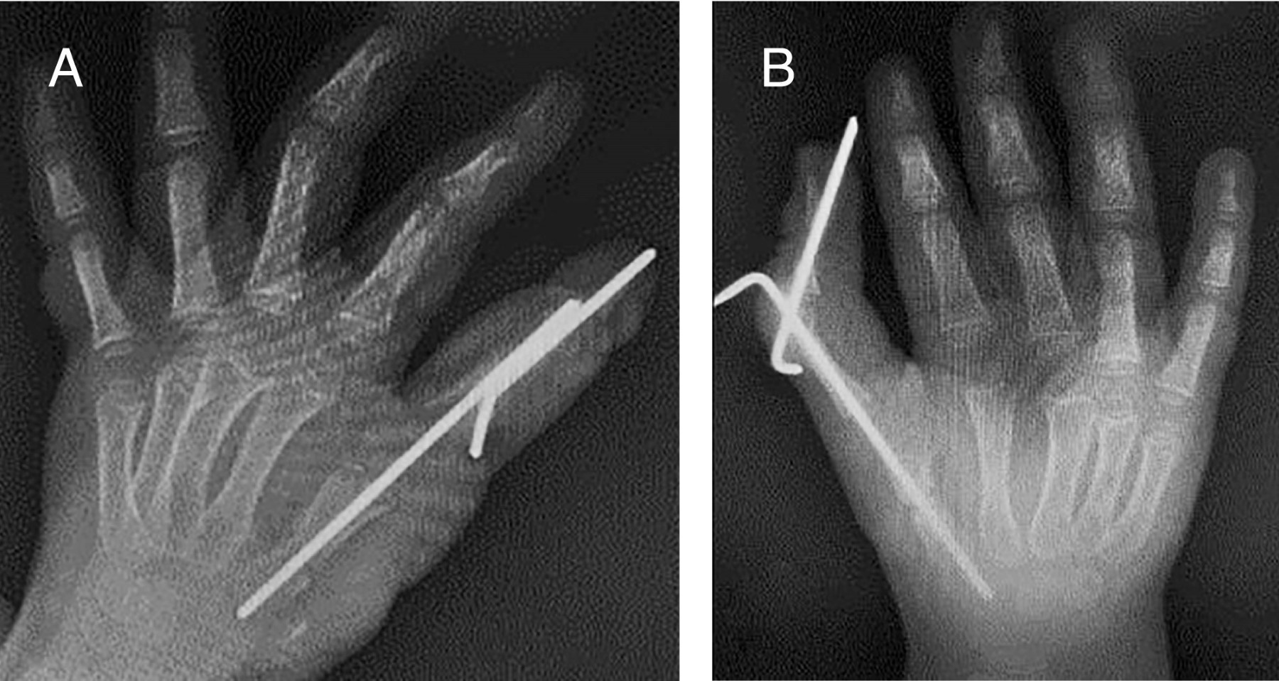 Es llevada a consulta de ortopedia pediátrica debido a presentar un pulgar trifalángico duplicado bilateral así como sindactilia de cuarto y quinto dedo de mano izquierda. En la exploración física inicial, la paciente presenta en ambas manos pulgares supernumerarios, ambos pulgares de longitud anormal, que sobrepasan la articulación interfalángica proximal del dedo índice, pulgar del lado radial sin flexo-extensión, pulgar radial y cubital bilateral con oposición inadecuada, además en mano izquierda presencia de sindactilia de anular y meñique. Radiografía dorso-palmar mano bilateral: donde se observa la presencia de una polidactilia radial, con metacarpo supernumerario y tres falanges. Mano derecha: donde se observa la presencia de un dedo pulgar supernumerario, dependiente de la primera articulación metacarpofalángica, con presencia de pulgar trifalángico, con falange adicional completa (Figura 1). Se ingresa a cargo del servicio de ortopedia pediátrica, para una resección de pulgar radial, la cual se realiza mediante la siguiente técnica quirúrgica: paciente bajo anestesia regional, se realiza una incisión dorsal en el espació entre el pulgar cubital y el dedo índice, además de una incisión a través de las articulaciones metacarpofalángicas, se procede a realizar una resección de la porción proximal del pulgar radial, mediante microsierra, posteriormente se realiza una osteotomía en metacarpiano de pulgar radial a nivel proximal, realizando una resección de todas las estructuras distales a dicho dedo, se realiza reducción y reconstrucción de metacarpos según la técnica de on top plasty y se fija con clavillos Kirschner de 1.2 mm, después se realiza la transferencia de abductor pollicis longus, flexor pollicis brevis y oponente del pulgar, se cierran heridas con sutura absorbible, se realiza mismo procedimiento en ambas manos.