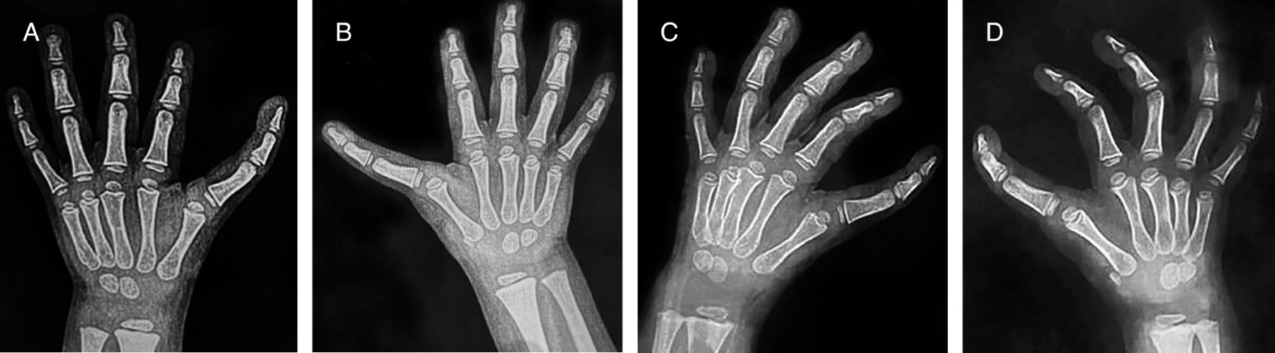 Un año después de la primera cirugía se observa presencia de pulgar trifalángico bilateral, con actitud en rotación externa de ambos pulgares con dificultar para la oposición y movimientos de pinza gruesa y fina, se solicitan radiografías dorso-palmares y oblicuas de mano observando consolidación total de ambos metacarpianos. Dos años posteriores acude a consulta de seguimiento donde se observa radiográficamente una consolidación total de primer metacarpiano bilateral, así como la presencia de una falange intermedia tipo rectangular (Figura 3), clínicamente se observa en ambas manos presencia de pulgar trifalángico, con dedo en actitud de rotación externa con dificultad para la oposición, con una longitud similar a dedo índice (Figura 4).