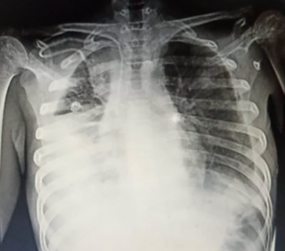 Estado al ingreso: presenta dificultad respiratoria de inicio insidioso y leve, a nivel torácico se ausculta hipoventilación y matidez basal de predominio derecho, a nivel abdominal hepatomegalia y esplenomegalia. Espalda baja con aumento de volumen, cadera izquierda con aumento de temperatura local, con dificultad para la bipedestación y la marcha, con ayuda de ortesis para su traslado. Por último, a nivel de genitales se halla hidrocele izquierda. Motivo por el cual se inicia protocolo de estudio con toma de radiográfico de tórax, el cual mostró derrame pleural en hemitórax derecho de etiología a determinar (Figura 1). Ameritó manejo por el servicio de cirugía para colocación de sello pleural con drenaje de alto gasto 3,400 mL de características lechoso, turbio, quilo con aumento del gasto de 4,500 cm3 con un total de 7,900 cm3. Durante su estancia hospitalaria se realiza reposición de líquidos a 100% más albumina. Así como manejo con oxígeno suplementario 5 L/min y antibioticoterapia con doble esquema de ceftriaxona y clindamicina. Se recaba estudio citológico y citoquímico de líquido pleural en el cual se halló un aumento de triglicéridos, por lo que se inicia manejo con octreotide. Tras una evolución tórpida, donde aumenta el gasto del quilotórax, con aumento de requerimiento de oxígeno a 7 L/min, una atelectasia sobreagregada y datos ultrasonográficos de fungomas en bazo, se inician cuidados avanzados por el servicio de unidad de cuidado intensivos (UCI) y se agrega anfotericina B al esquema antimicrobiano. Por otro lado, se realiza protocolo de estudio de baciloscopias seriadas para descartar tuberculosis ósea y marcadores tumorales con reporte negativos para ambos (fracción beta gonadotropina coriónica humana (GCH) 0.100 y alfafetoproteína (AFP) 0.60).