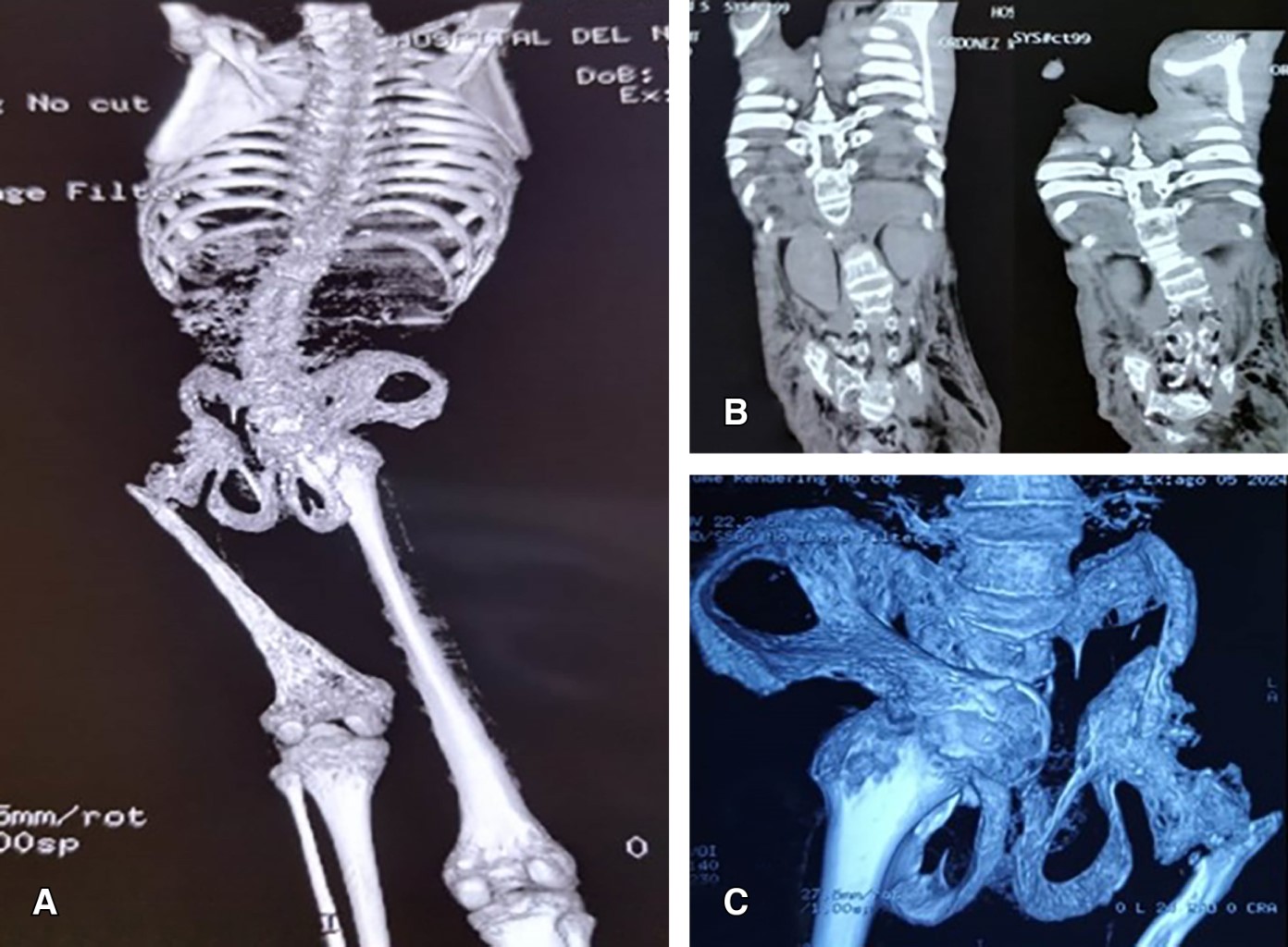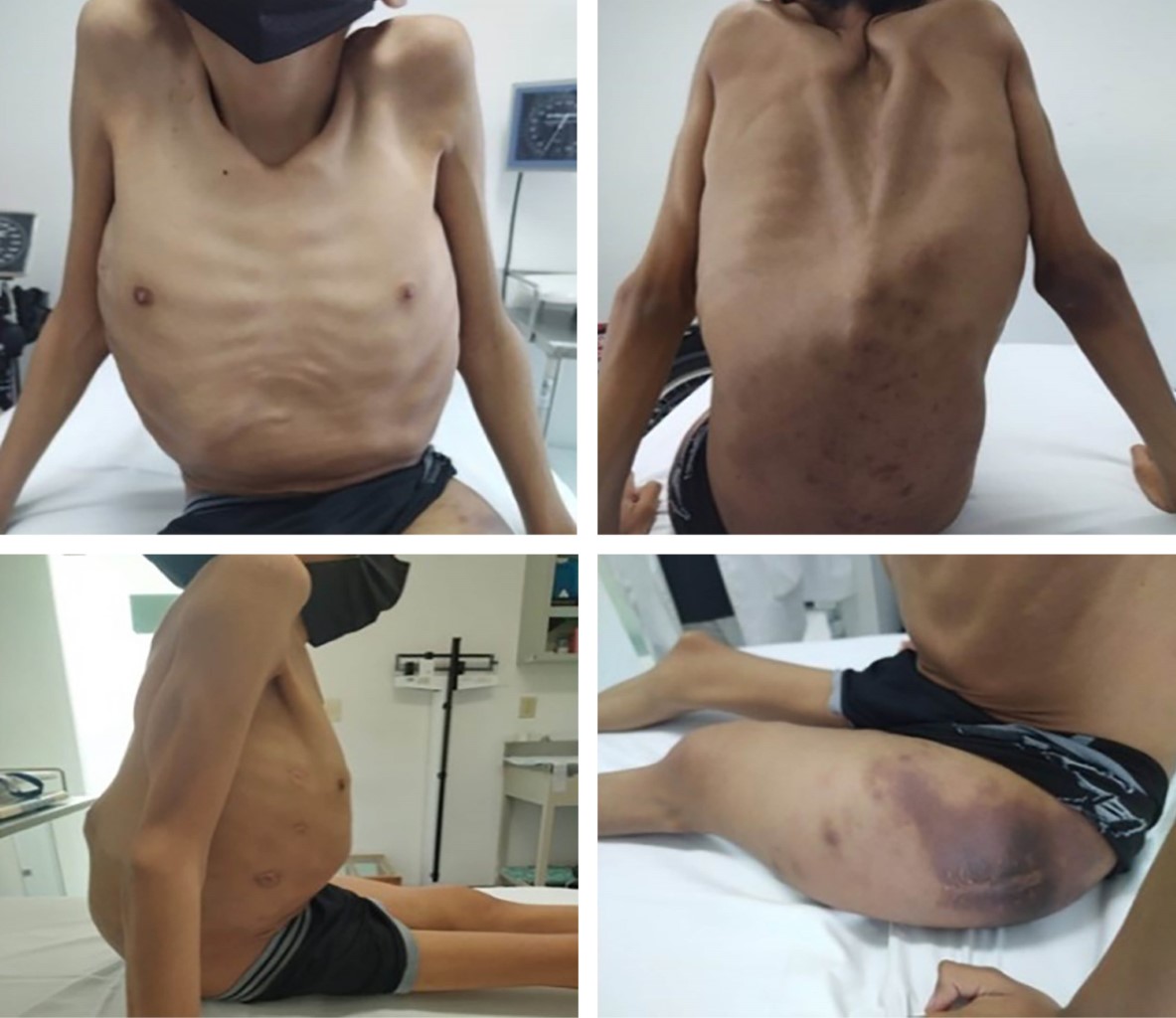 Se inicia sirolimus 1.6 mg al día y se continúa con octreótida, mostrando una reducción del quilotórax a 90 mL, una mejoría hemodinámica y ventilatoria. Actualmente el paciente, tras un año de evolución, se encuentra hemodinámicamente estable, sin recidiva pulmonar. Sin embargo, a nivel osteomuscular con un pronóstico desfavorable, se observa un fenotipo caquéxico, con tórax en tonel y atrofia muscular (Figura 4). Topográficamente persiste la destrucción ósea marcada a nivel columna, pelvis y cadera izquierda.