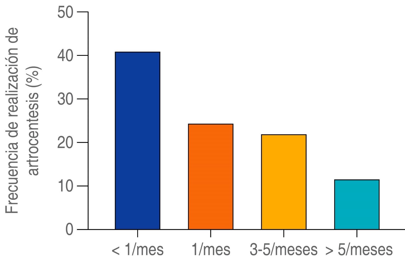 En cuanto a la formación médica de los evaluados, se investigó si durante su formación habían recibido algún tipo de entrenamiento para la realización de la artrocentesis y para el análisis de LS. Setenta y dos punto ocho por ciento si recibieron alguna capacitación, contra 27.2% que nunca habían recibido algún entrenamiento. Enfocándonos en la consulta médica, identificamos que 41.2% de los encuestados realizaba menos de una vez al mes el procedimiento de la artrocentesis, 24.7% lo realizaban una vez al mes, 22.4% entre tres y cinco veces y 11.8% más de cinco artrocentesis mensuales (Figura 1).