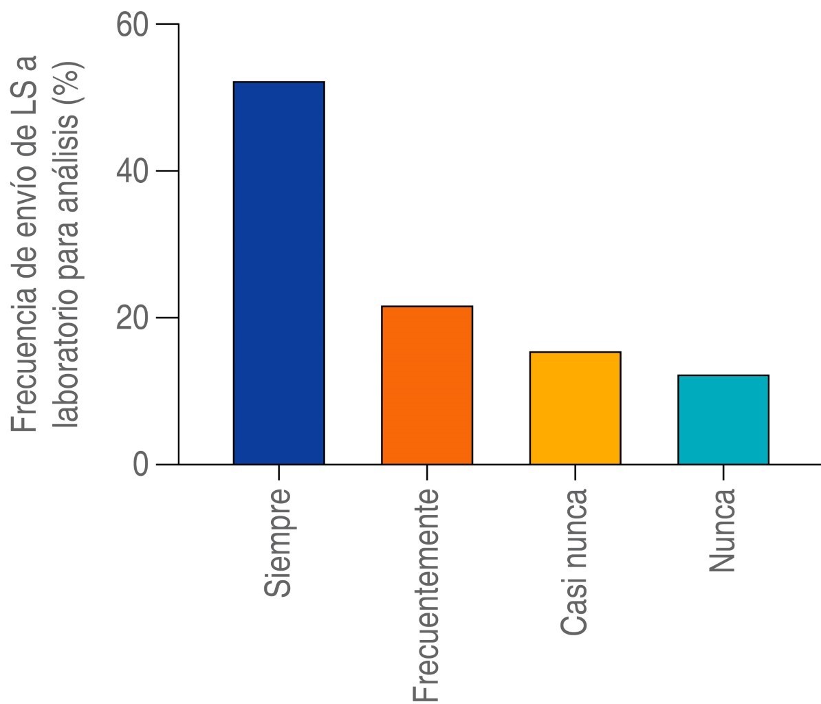 En cuanto al envío del LS extraído a algún laboratorio para su análisis, la mayoría, es decir, 52.8% siempre lo envía, 21.3% frecuentemente, un grupo menor de encuestados (14.6%) casi nunca y un 11.2% nunca (Figura 3).