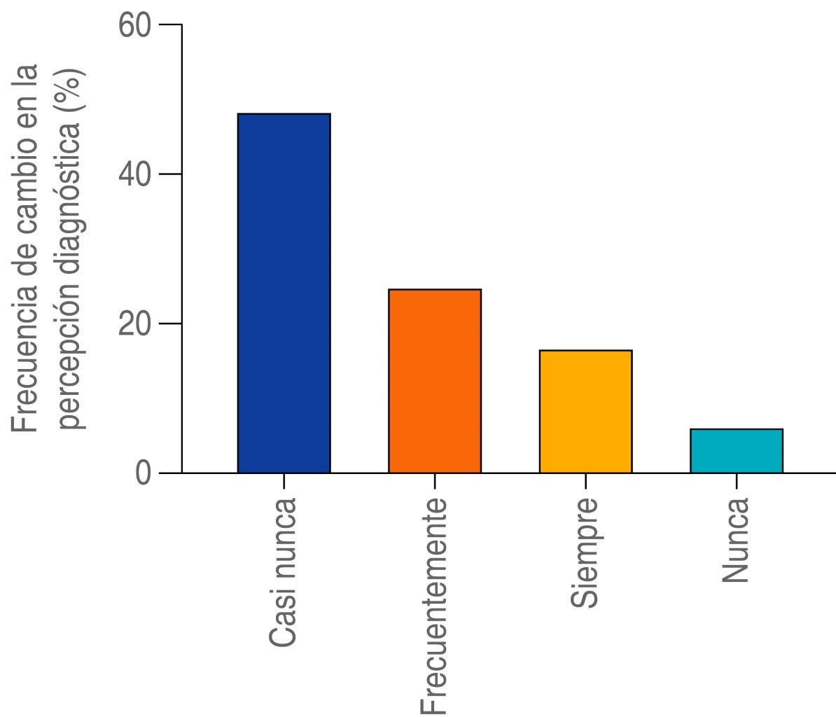 Asimismo, 94.1% de los encuestados consideran la utilidad del análisis del LS en la confirmación diagnóstica y sólo una pequeña fracción valora el análisis para evaluar la efectividad de las terapias (2.4%), el análisis con fines de investigación tuvo una baja frecuencia. Con respecto al impacto del análisis de LS en la percepción diagnóstica, la mayoría de los encuestados (50.6%) respondieron que el análisis de LS casi nunca la cambia; sin embargo, un porcentaje considerable (27.6%) indicó que sí lograban cambiarla de manera frecuente, algunos encuestados (17.2%) afirmaron que siempre y una minoría (4.6%) nunca cambia su percepción diagnóstica (Figura 5).