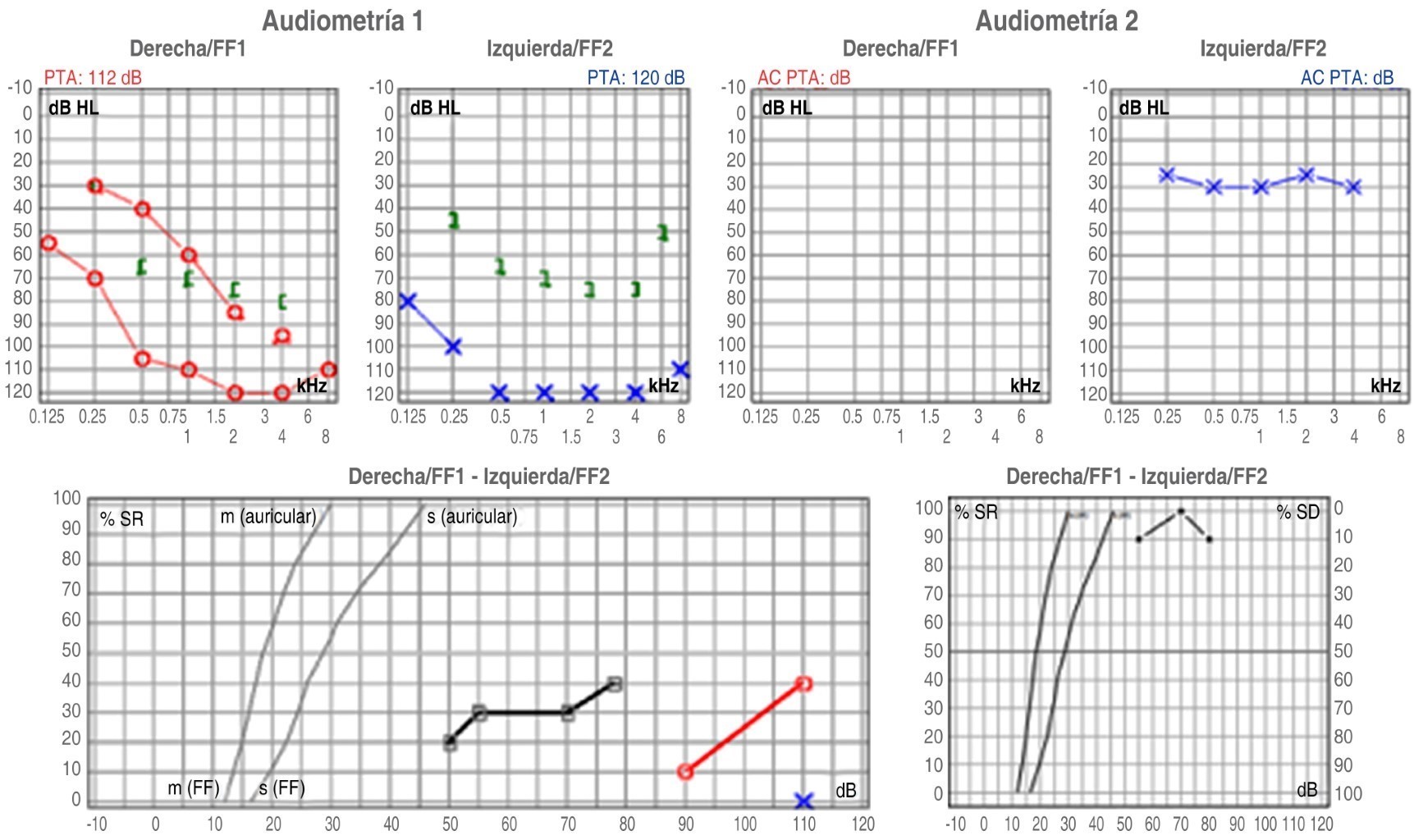 Nuestro estudio refuerza estos hallazgos, mostrando una mejora sustancial en el rendimiento auditivo en todos los pacientes después de 12 meses de uso del implante coclear. Interesantemente, no se observaron diferencias significativas entre los pacientes que habían recibido tratamiento médico o quirúrgico previo a la implantación, ni en relación al tipo de electrodo utilizado. Se registró un aumento significativo en el reconocimiento de palabras, con al menos 30% de mejoría. Como podemos observar en la Figura 1, se evidencia de forma objetiva la favorable evolución de uno de los pacientes, llegando a un reconocimiento de palabra posterior a la implantación de 90%.