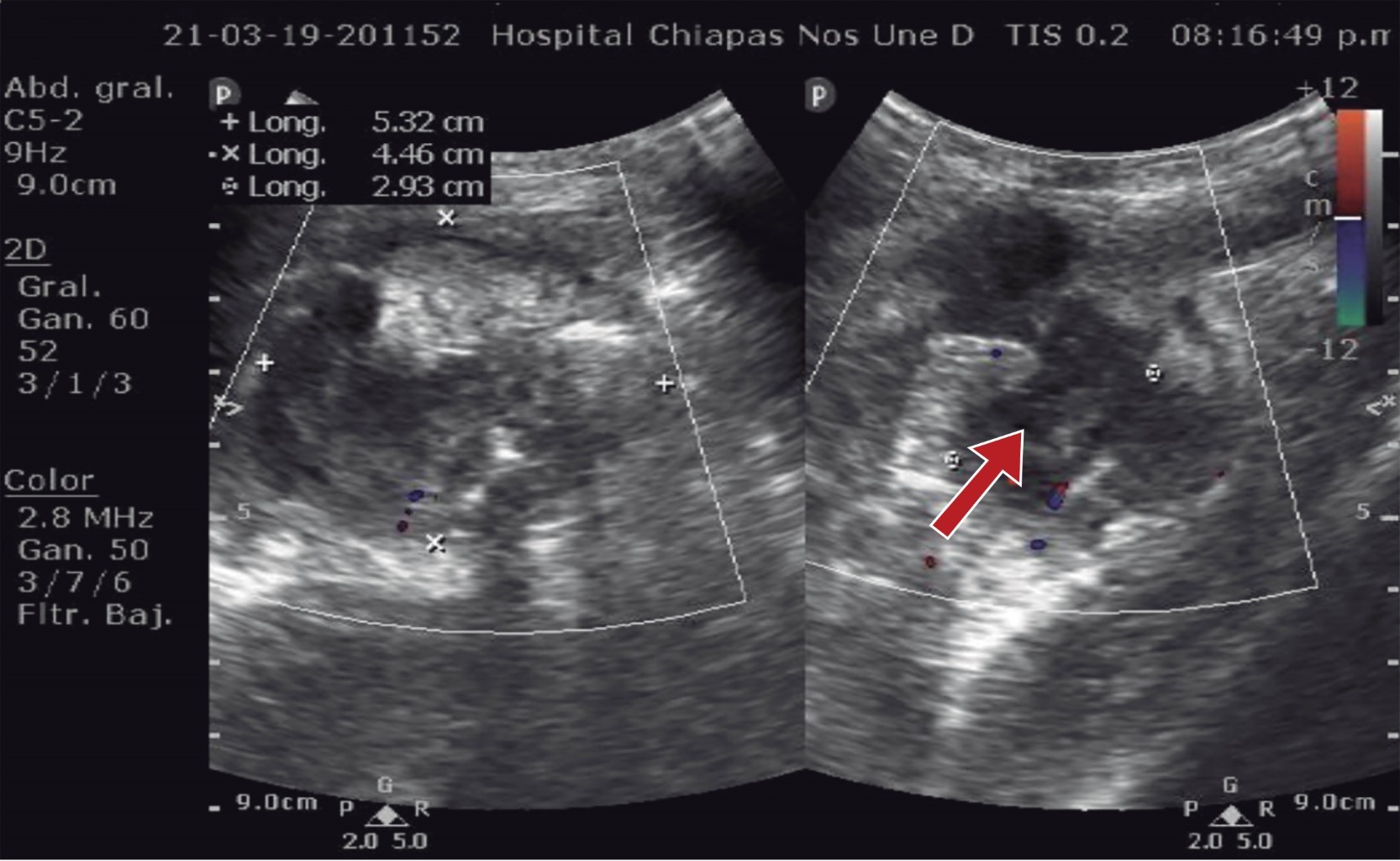 Masculino de nueve años con antecedente de haber sido intervenido quirúrgicamente por apendicitis aguda dos años y medio previos a su padecimiento actual, el cual inicia 10 días antes de su ingreso y se caracteriza por dolor abdominal generalizado y vómitos en dos ocasiones de características gastroalimentarias, manejado por facultativo con analgésicos no especificados y sin mejoría. Continúa con dolor abdominal de predominio en el cuadrante inferior derecho acompañado de náuseas y vómitos. Motivo por el cual acude al Servicio de Urgencias del hospital, en donde se encuentra al paciente con dolor en cuadrante inferior derecho, posición en gatillo y con datos de irritación peritoneal. Se solicitan laboratoriales, reportándose hemoglobina de 13.0 mg/dl, hematocrito de 38.2%, 15.15 × 109, 76.4% neutrófilos. La placa simple de abdomen muestra una imagen de asa fija en fosa iliaca derecha (Figura 1). Se solicita ultrasonido abdominal, el cual reporta una colección de 5 × 4 cm (Figura 2), por lo que se interconsulta al Servicio de Cirugía General ya que no se contaba con cirujano pediatra en el turno; 24 horas después de su ingreso es valorado por cirugía, encontrando al paciente con discreta resistencia voluntaria en cuadrante inferior derecho e irritación peritoneal. Se solicita una resonancia magnética abdominal, para determinar la probable etiología de la colección, la cual reporta una colección amorfa en fosa iliaca derecha, de bordes irregulares y bien definidos, con medidas de 5.1 × 4.3 × 4.9 cm en sus diámetros longitudinal y anteroposterior transverso, respectivamente, compatibles con absceso en fosa iliaca derecha.