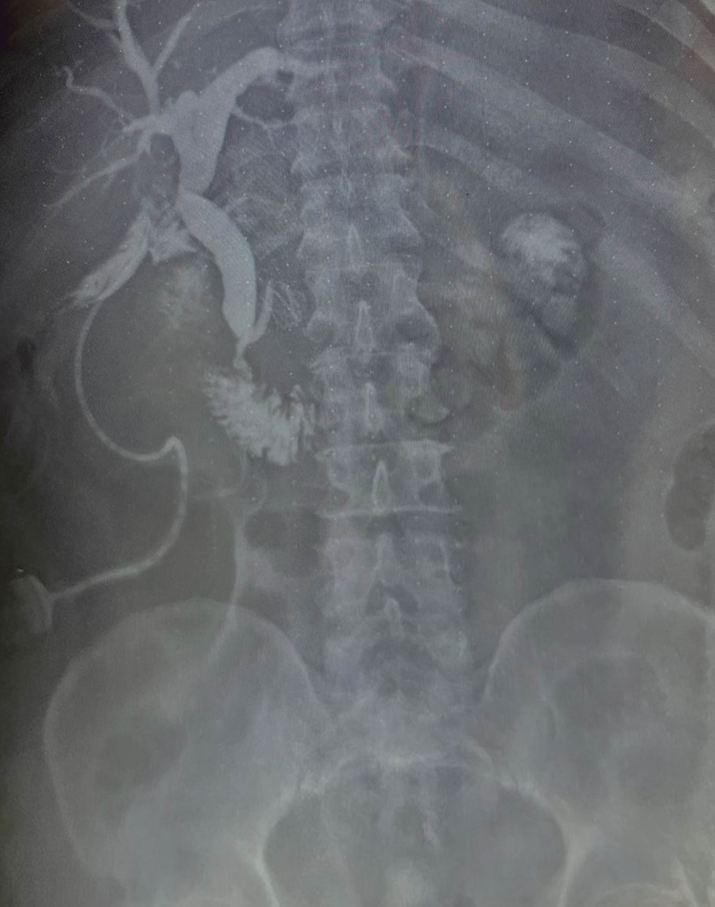 Masculino de 64 años, quien inicia su padecimiento con ictericia, negando otra sintomatología, llama la atención que se manifesta durante al menos tres días previos a su llegada a urgencias, su exploración física sin alteraciones, los laboratorios revelan una bilirrubina total de 25 mg/dl, bilirrubina directa de 22 mg/dl, fosfatasa alcalina 235 UI/l, gamma-glutamil transferasa 157 UI/l, creatinina 2.5 mg/dl, el resto de los laboratorios normales, se le realiza un ultrasonido de abdomen que reporta vesícula biliar mal definida, y dilatación de la vía biliar de 19 mm (Figura 1), se observa lito en colédoco de alrededor de 12 mm. Se integra el diagnóstico de coledocolitiasis, no obstante, se solicitan marcadores tumorales, con reporte de CA 19-9 de +8,000 UI; se solicita colangiorresonancia, la cual evidencia dilatación de vía biliar (vb) de 20 mm, lito de 16 mm a nivel del ámpula, no se reporta morfología de la vesícula biliar (VB), paciente candidato a colangiopancreatografía retrógrada endoscópica (CPRE) según el servicio de Gastroenterología. Se le realiza CPRE sin poder extraer lito, se programa para colecistectomía con exploración de vía biliar, el transoperatorio revela biliperitoneo, lisis de VB, fístula colecistocoledociana (Figura 2), litio único de 15 mm, se coloca sonda T, no se cuenta con servicio de cirugía hepatopancreatobiliar, por lo que no se realiza reparación definitiva, colangiografía transoperatoria revela paso de material de contraste a duodeno, sin fugas aparentes por orificio fistuloso (Figura 3), evolución posoperatoria favorable, el drenaje por sonda T en promedio 500 ml por día con disminución progresiva, con mejoría de hiperazoemia, con flujo urinario mayor a 0.5 ml/kg/h, colangiografía posoperatoria sin fugas, paso de medio de contraste a duodeno, reporte de patología revela adenocarcinoma de vesícula moderadamente diferenciado con infiltración a muscular (Figura 4). El paciente rechaza tratamiento médico y decide egreso voluntario, comprende y acepta los riesgos, no contamos con seguimiento a largo plazo.