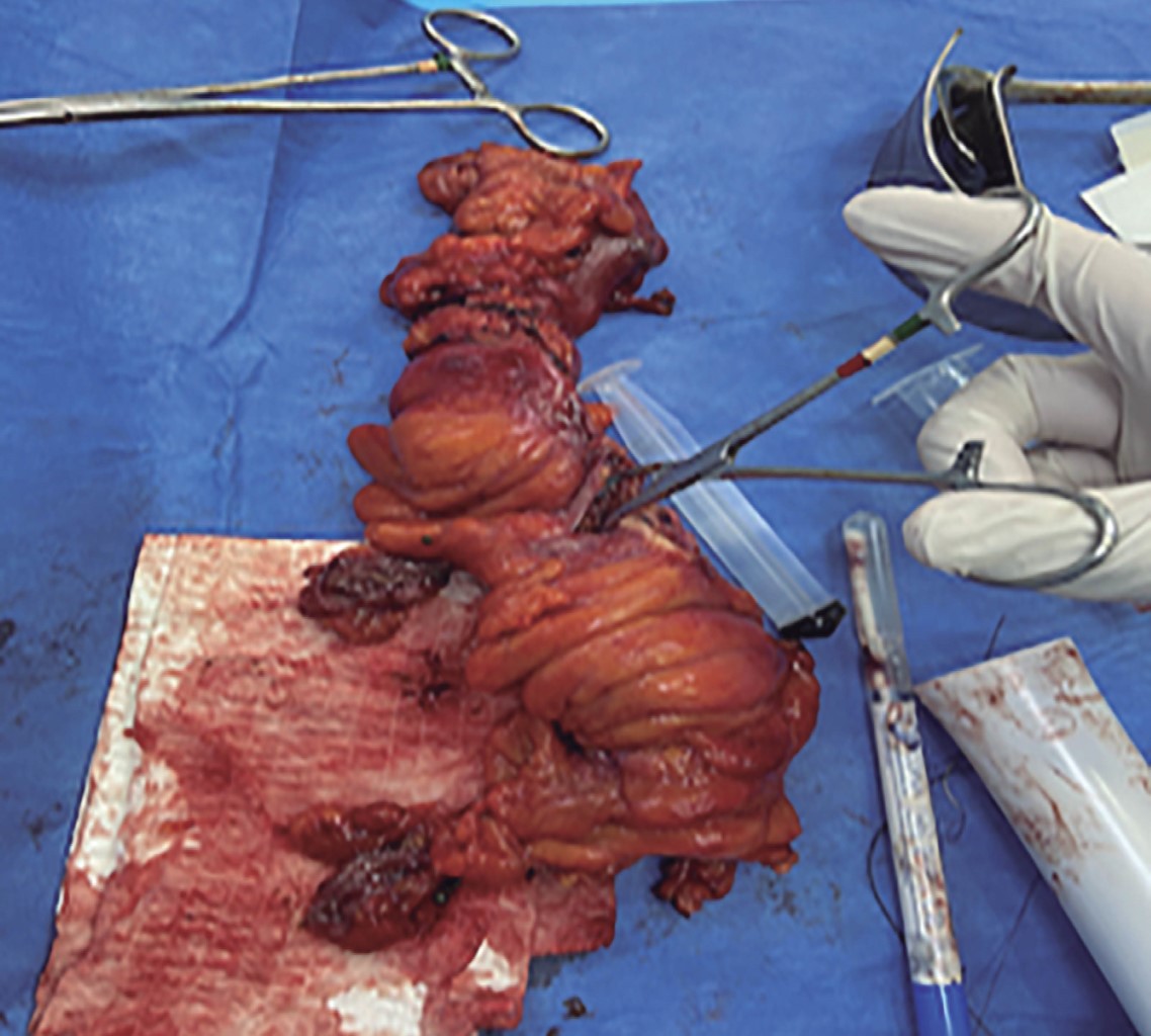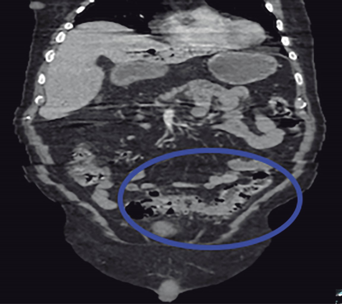 Masculino de 77 años con antecedentes de diabetes mellitus 2 e hipertensión arterial sistémica de larga evolución, antecedentes quirúrgicos de colecistectomía laparoscópica hace seis años y cateterismo cardiaco por cardiopatía isquémica crónica. Inicia su padecimiento actual 10 días previos a su ingreso con cuadro de dolor abdominal difuso en cuadrantes inferiores, así como ataque al estado general acompañado de astenia e hiporexia. Fue manejado por facultativo externo con antibioticoterapia. A su llegada al Servicio de Urgencias se presenta con taquicardia y tendencia a la hipotensión acompañado de alteración del estado de alerta. A la exploración física se palpa plastrón inflamatorio en cuadrante inferior izquierdo que despierta dolor a la manipulación del mismo, sin embargo, no hay datos de irritación peritoneal, sus laboratoriales con leucocitos 13,400 mm3, neutrofilia 92.9% y lactato de 3.9 mmol/l. Se solicita tomografía abdominopélvica contrastada en donde se muestra trombosis de la vena porta (Figura 1), neumatosis portal (Figura 2) y enfermedad diverticular (Figura 3), por los hallazgos anteriores se da manejo inicial con soluciones intravenosas y antibioticoterapia empírica de amplio espectro con piperacilina-tazobactam 4.5 g IV cada 8 horas, posterior al manejo estabilizador se realiza laparotomía exploradora, en donde se realiza sigmoidectomía y colostomía terminal debido a los hallazgos de perforación diverticular (Figuras 4 y 5) y plastrón inflamatorio purulento en el mesosigmoides con especial distribución en el trayecto de la vena mesentérica inferior, se toma cultivo y se maneja el posoperatorio en terapia intensiva, se deja antibioticoterapia dirigida a E. coli. Se calcula nutrición parenteral total y se inicia terapia anticoagulante con enoxaparina 60 mg subcutáneos (SC) cada 12 horas. El paciente cursó con evolución clínica favorable gracias al manejo multidisciplinario que se brindó. Egresó a la semana del procedimiento quirúrgico sin complicación alguna, se cita a consulta externa una semana después de su egreso tolerando vía oral con estoma funcional y con la herida afrontada. El reporte de histopatología reveló enfermedad diverticular complicada.