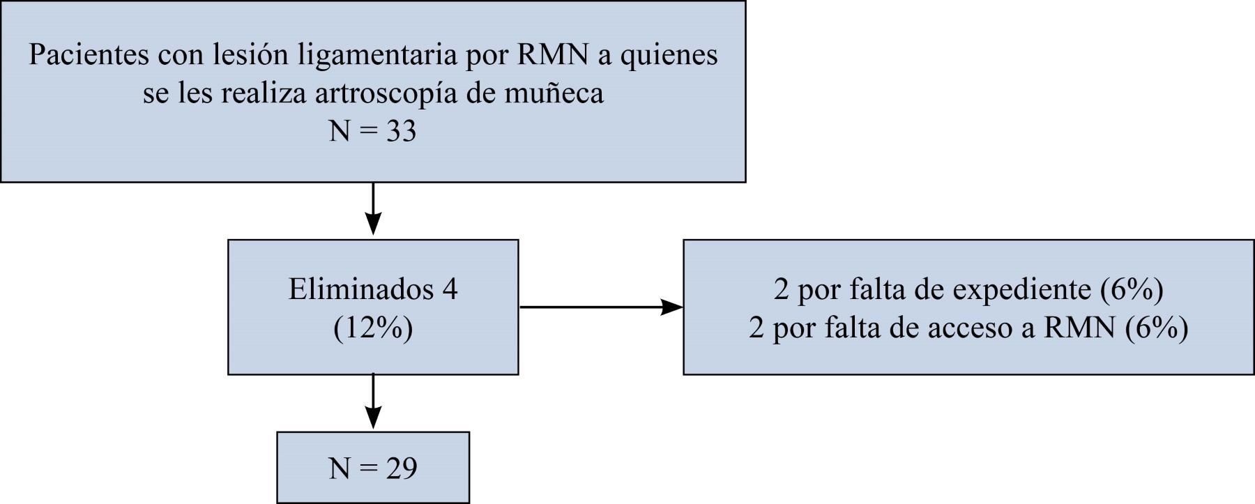 Criterios de exclusión: 1) pacientes que hayan recibido tratamiento conservador; 2) sujetos que hayan recibido tratamiento quirúrgico diferente a artroscopía de muñeca; y 3) casos con diagnóstico realizado mediante un método diferente a resonancia magnética simple de muñeca.