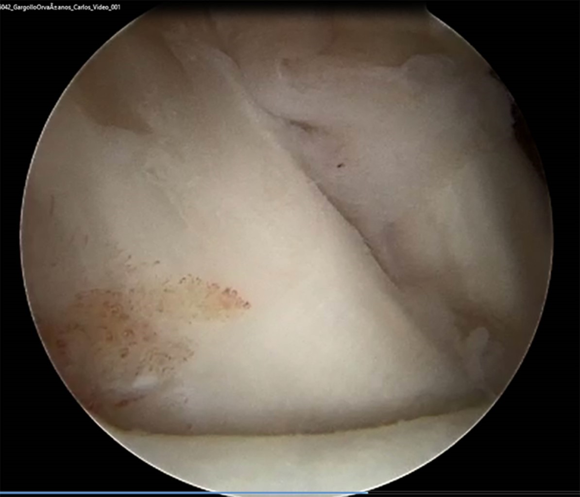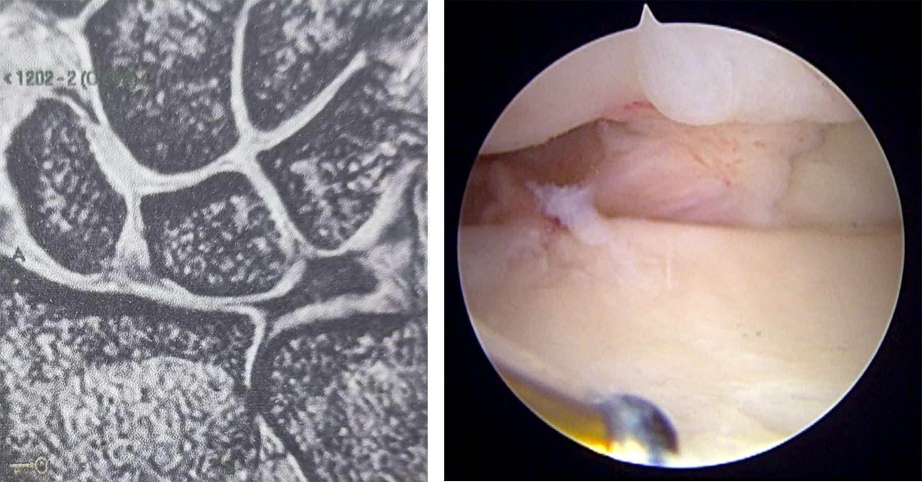 Se incluyeron a todos los pacientes que cumplieron con los criterios de inclusión de los que se tiene registro para este estudio, aunque la muestra fue pequeña. Asimismo, se decidió agotar todas las opciones terapéuticas no invasivas antes de pasar a la reparación quirúrgica mediante artroscopía de muñeca, por lo que existe una mayor ventana de tiempo entre la resonancia magnética y la artroscopía de muñeca, pudiendo dar espacio a una mayor cantidad de lesiones y/o gravedad de estas. En la Figura 2 se observa lesión del ligamento escafosemilunar observada mediante resonancia magnética y artrosocopia de muñeca en el mismo paciente. En la Figura 3 se observa lesión del fibrocartílago triangular Palmer 1D. Y en la Figura 4 se observa lesión del ligamento radioescafogrande.