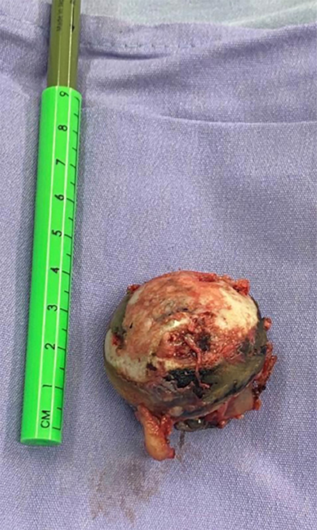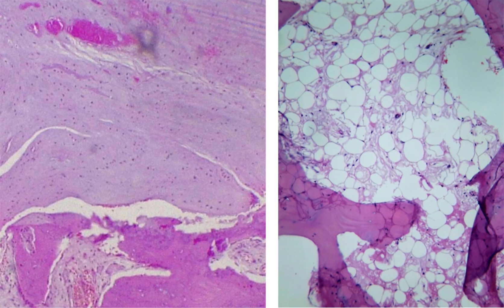 En quirófano, con el paciente bajo bloqueo mixto, se realizó un reemplazo total de cadera derecha mediante un abordaje posterior, con prótesis de doble movilidad G7 (por antecedente de espondiloartropatía con anquilosis lumbar), con vástago Taper lock (Zimmer Biomet). Durante el procedimiento se observó de manera macroscópica la presencia de zonas oscuras en cabeza y cuello femoral, propias de depósitos AHG (Figura 2). El procedimiento finalizó sin complicaciones, con control radiológico postquirúrgico (Figura 3). El examen patológico macroscópico refirió cabeza femoral con manchas obscuras con parches en tejido óseo y cartilaginoso; la imagen histopatológica se muestra en la Figura 4.