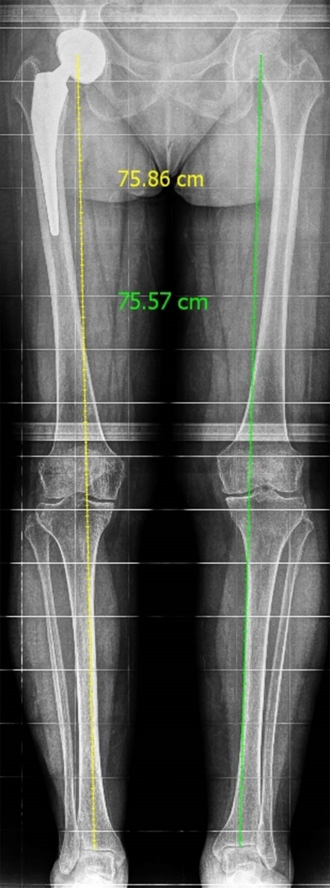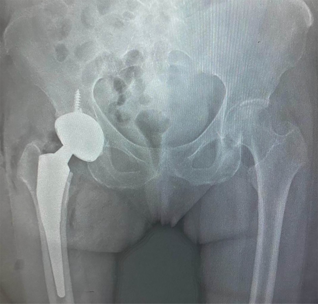 Se realizó seguimiento a las dos, cuatro y ocho semanas, sin encontrar sintomatología local ni sistémica. A los seis meses de postoperada, la paciente presentó marcha sin alteraciones, sin dismetría de miembros pélvicos y sin dolor referido. Se valoró mediante la escala de Harris modificada, obtuvo un puntaje de 82, que se define como un resultado bueno. Posteriormente, se llevó a cabo un seguimiento postoperatorio de 12 meses, durante el cual la paciente mostró progresión clínica satisfactoria con mejoras en los rangos de movimiento. No se observaron anomalías en la marcha y la paciente informó la ausencia de dolor. El puntaje de cadera Harris modificado se volvió a calcular, obteniendo una puntuación de 90, el cual se define como un resultado excelente. Además, se realizó una escanometría de control anual donde se encuentra implante sin datos de aflojamiento a nivel pélvico ni femoral, sin acortamiento de extremidades (Figura 5).