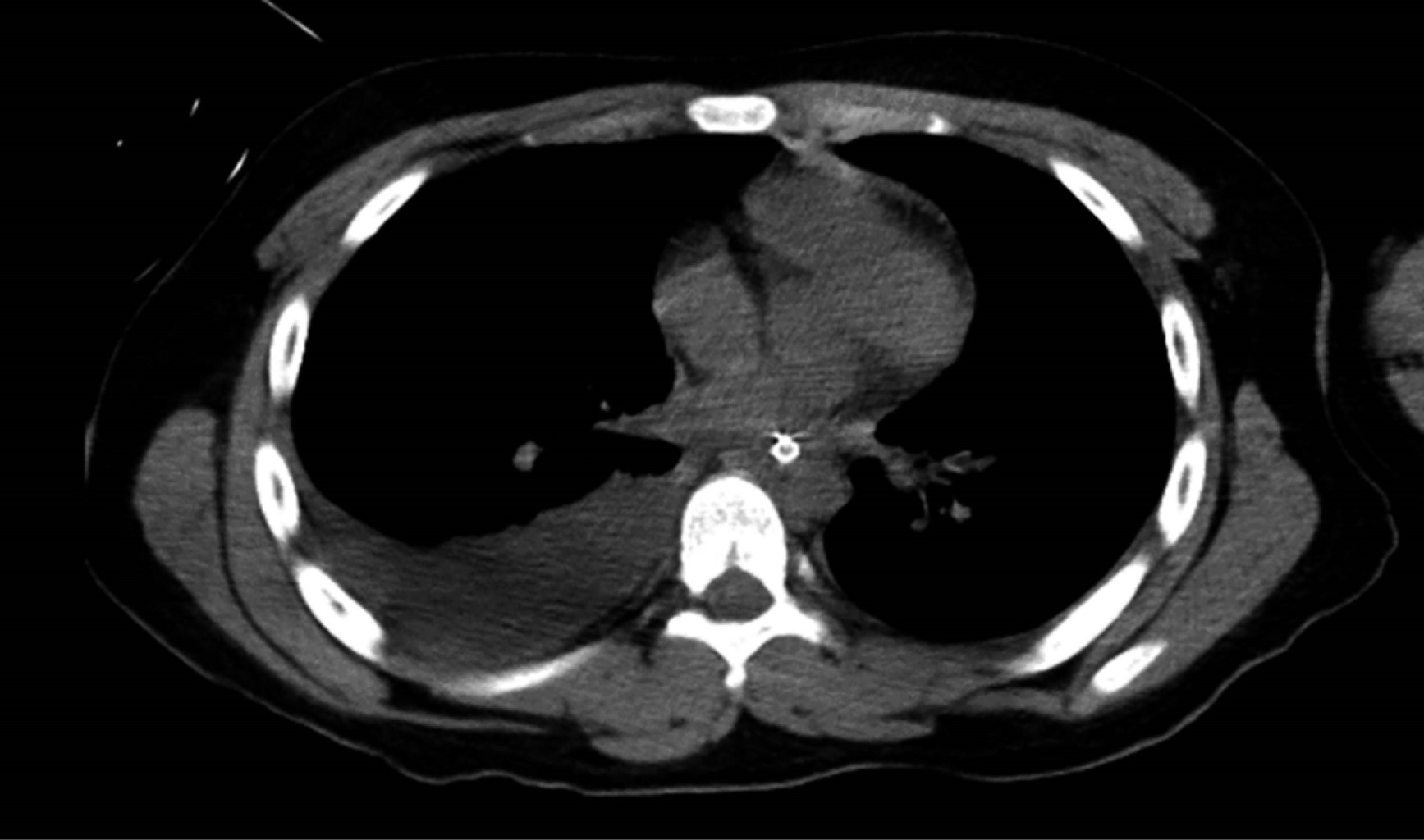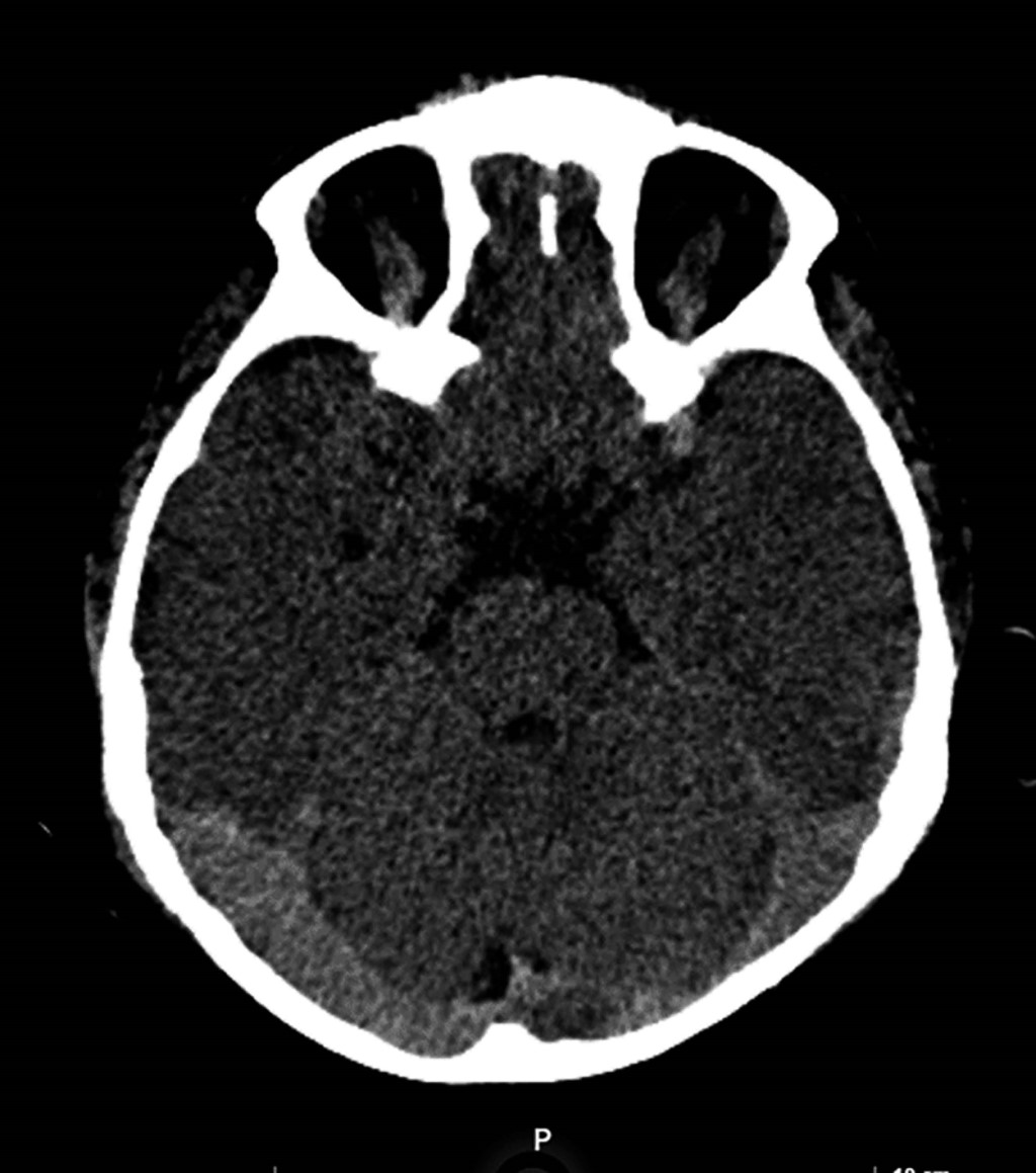 Tuvimos una defunción, correspondió a un varón de seis años, previamente sano, nueve días previos con cuadro gripal, dolor abdominal, vómito, fiebre no cuantificada. Posteriormente presentó hematemesis y epistaxis; al presentar alteración del estado de alerta acudió a nuestro hospital, ingresando con Glasgow de 10, dolor abdominal intenso. Sus resultados de laboratorio se expresan en la Tabla 5. En la tomografía pulmonar se aprecia derrame pleural (Figura 1) y en la tomografía craneal hemorragia subaracnoidea en región occipital (Figura 2). El paciente presentó paro cardiorrespiratorio, recibió maniobras de reanimación avanzada; sin embargo, falleció.