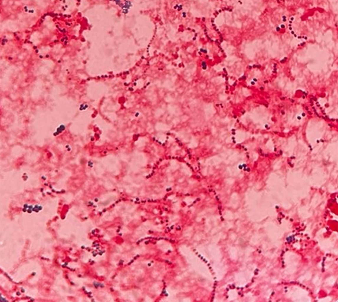 Se solicitan estudios de laboratorio al ingreso con biometría hemática que reporta hemoglobina 14.4 g/dL, hematocrito 43.1%, leucocitos 11,300 × 103 mm3, neutrófilos 10,200 × 103 mm3, linfocitos 600 × 103 mm3, monocitos 500 × 103 mm3, plaquetas 120,000 × 103 mm3, proteína C reactiva 44.2 mg/dL; pruebas de funcionamiento hepático con aspartato aminotransferasa 35 U/L, alanina aminotransferasa 39 U/L, bilirrubina total 1.4 mg/dL, creatinina 2.5 mg/dL, urea 113 mg/dL, glucosa 118 mg/dL. En la microscopia del hemocultivo periférico, con desarrollo a las 24 horas, se observaron dos colonias de cocos grampositivos en racimos y en cadenas (Figura 2). Tomografía de abdomen con aumento de volumen en tejido celular subcutáneo y aparente colección y/o hematoma a nivel de la pared anterolateral izquierda de abdomen (Figura 3).