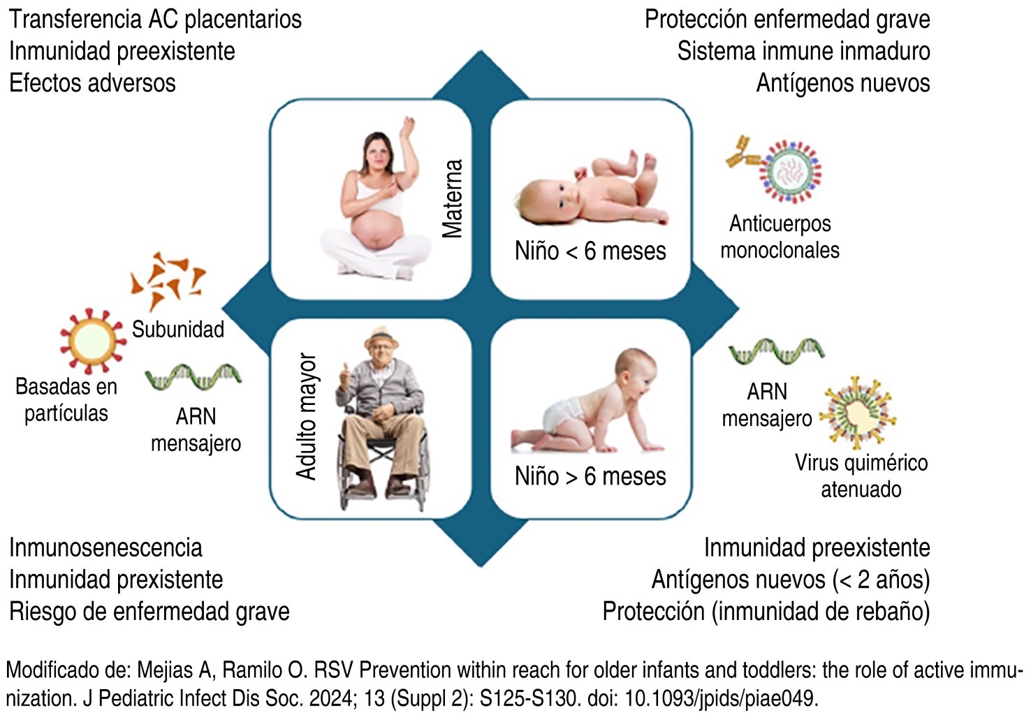 Existen vacunas en este grupo de edad contra Streptococcus pneumoniae, Haemophilus influenzae tipo b y virus influenza, pero al ser el VSR el patógeno de mayor incidencia a esta edad, es imperativo pensar en una estrategia de vacunación para cubrir a este patógeno.