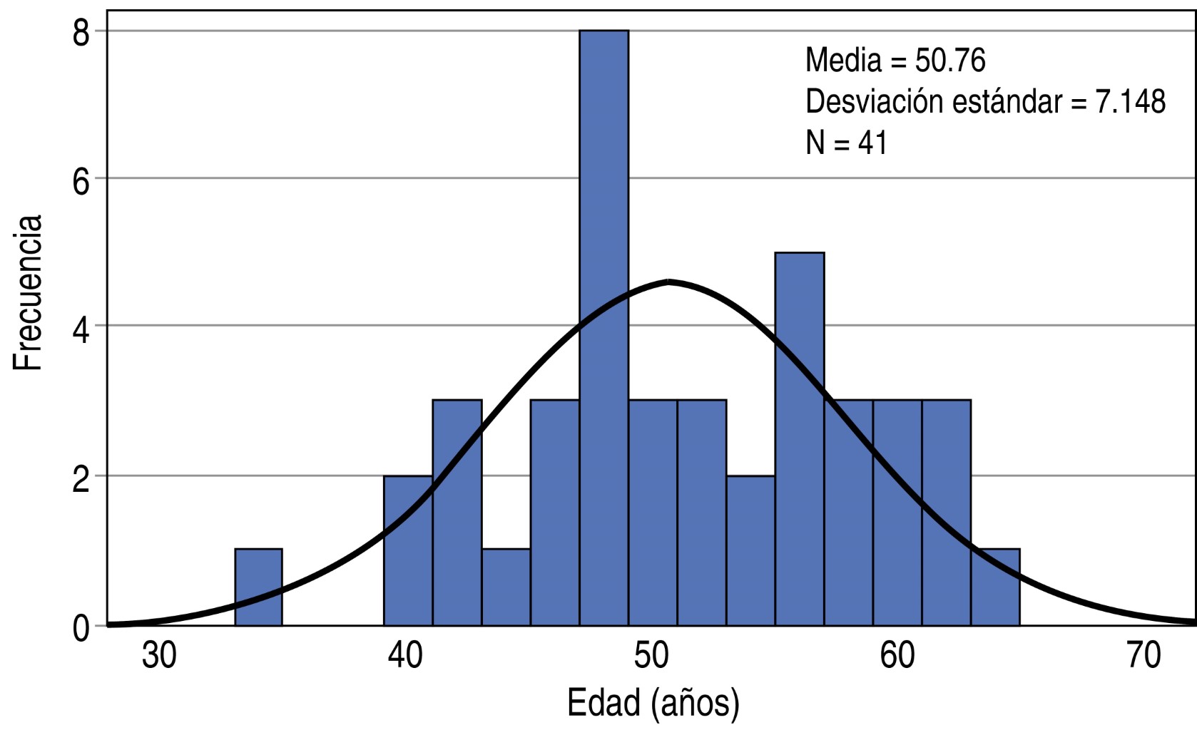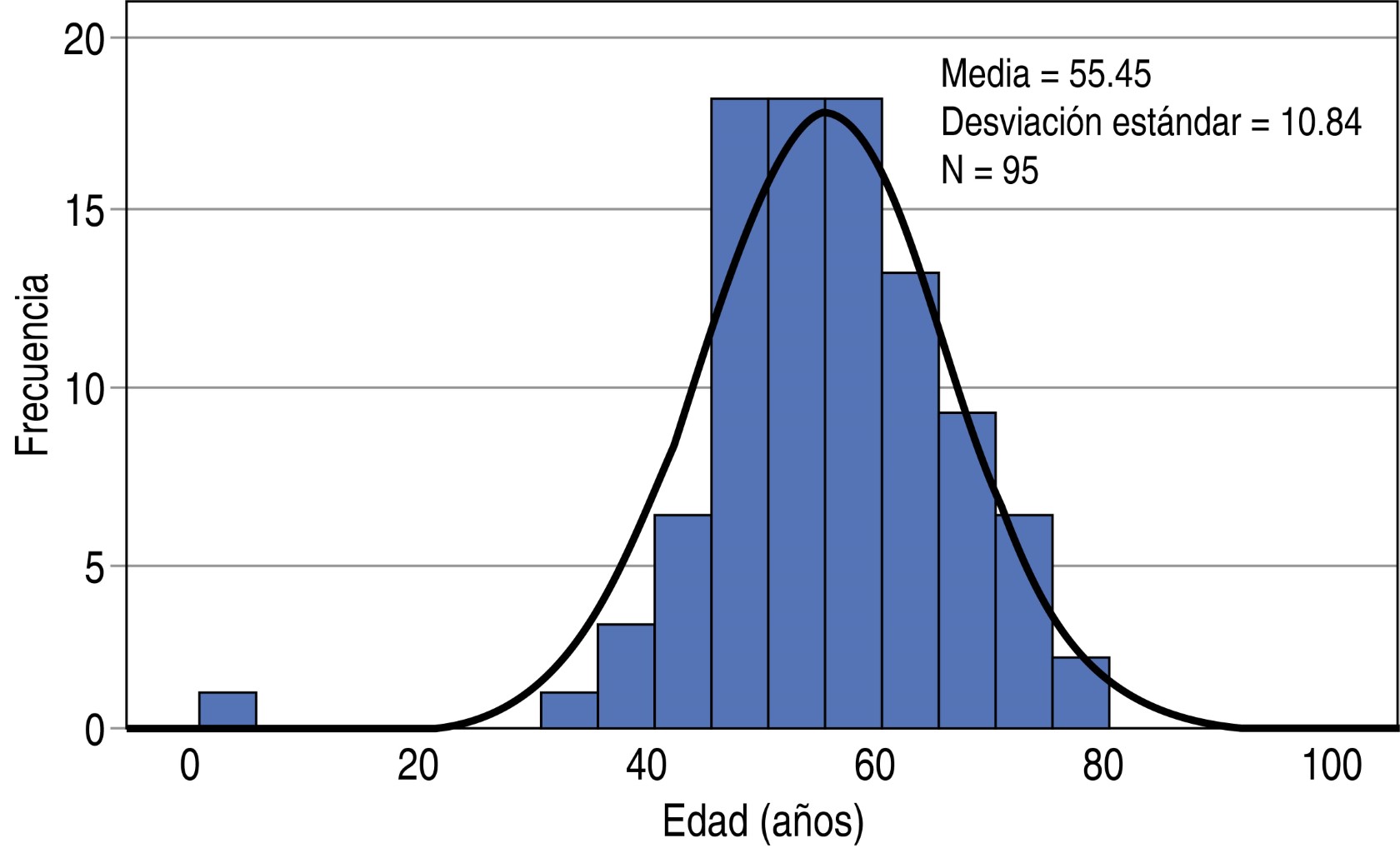 Se identificaron 95 pacientes con diagnóstico de tenosinovitis flexora en los dedos, de los cuales 76 eran mujeres (80%) y 19 hombres (20%) (Tabla 1). Durante el año 2023 se realizaron la mayor cantidad de procedimientos: 32 (33.7%), con respecto a los años anteriores, 2020 (7.4%), 2021 (26.3%), y 2022 (32.6%). La edad promedio fue de 55.45 años, con una desviación estándar de 10.8 y unidad de rango de 75 años máximo y mínimo de tres años (43%) (Figura 1). Se enfatiza que la afectación se presentó en derechohabiente mujeres trabajadoras activas, con 41 casos (43%), seguido de 13 mujeres jubiladas (13.7%), 11 madres (11.6%) y nueve esposas (9.5%) (Tabla 2). Se identificó que la mano derecha fue la más afectada, con una frecuencia de 55 casos (57%) y la izquierda con 40 (42.1%), siendo el primer dedo el más afectado con 51 casos (52.6%), seguido del tercer dedo con 35 casos (36.8%), cuarto dedo con 15 casos (15.8%) y el segundo y quinto dedos respectivamente, con 12 casos (12.6%). Las poleas más afectadas fueron las A1 con 83 casos (87.4%) y sólo se presentó un caso de adhesión en la polea A2 (11.6%). Durante la búsqueda, se asociaron a este padecimiento dos patologías: el síndrome de De Quervain en 15 mujeres afectadas (15.8%), seguido por el síndrome de túnel del carpo en 14 (14.7%) y un solo caso donde se encontraron ambas patologías (Tabla 3). Todos los casos fueron tratados quirúrgicamente, siendo la descompresión del tendón flexor de la mano derecha el tratamiento más realizado (23.2%). Al evidenciar un alto porcentaje en mujeres trabajadoras, se analizó el rango de edad promedio, el cual fue de 50 años, con una desviación estándar de 7.1. El rango mínimo de edad fue de 34 años y máximo de 63, siendo los 50 años la edad más frecuente para presentar esta patología en mujeres trabajadoras activas (Figura 2).
