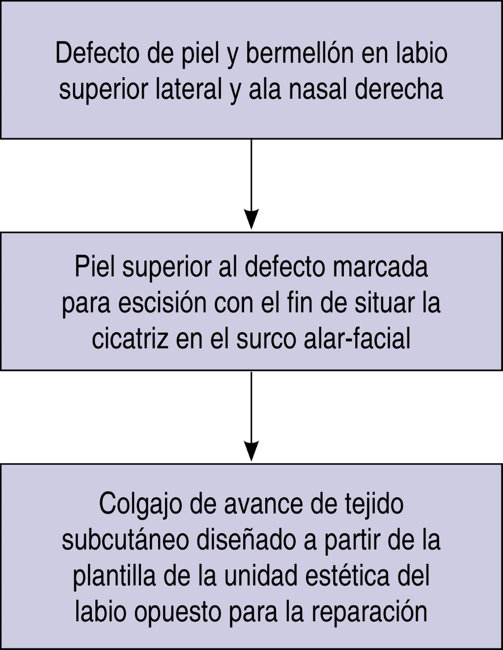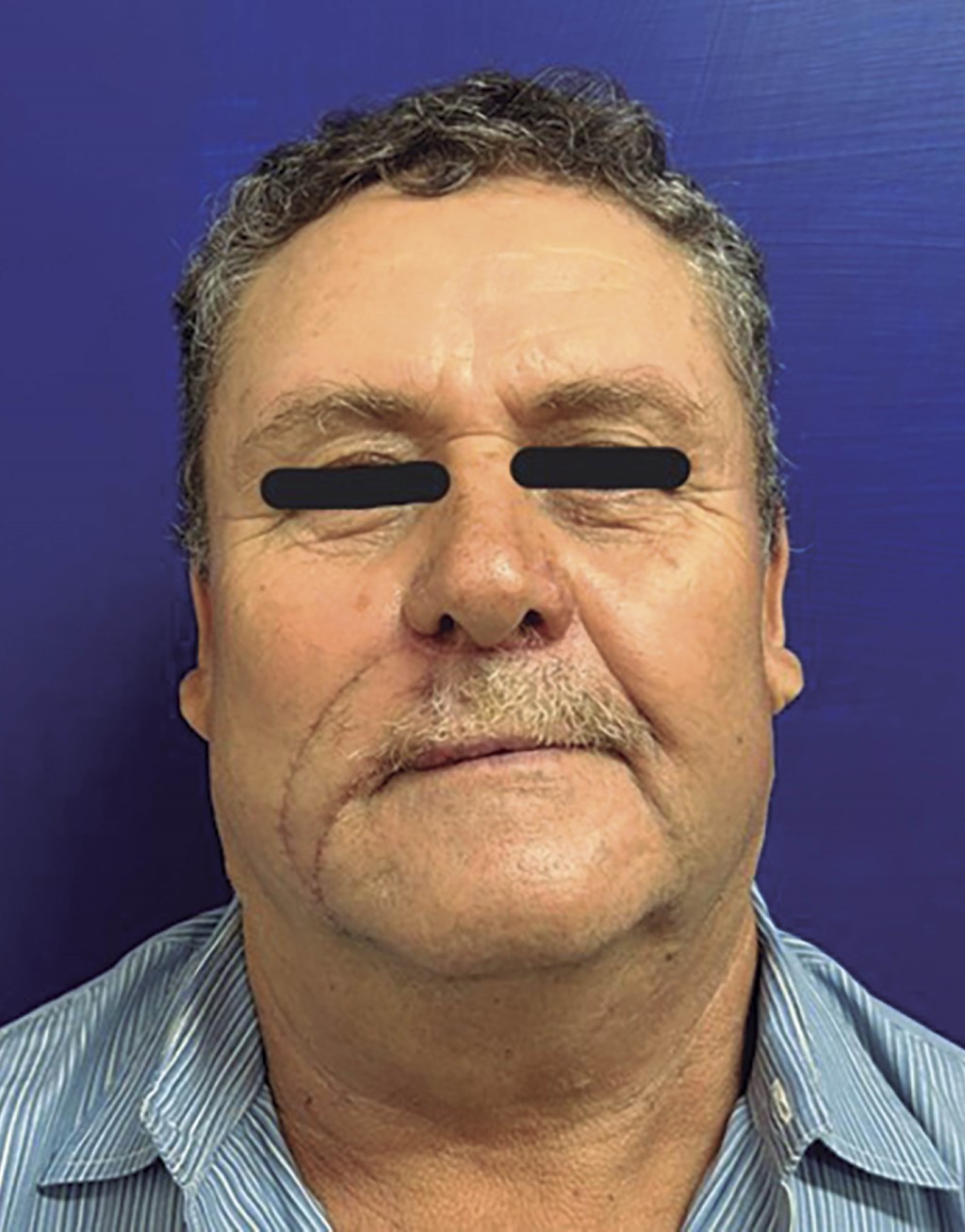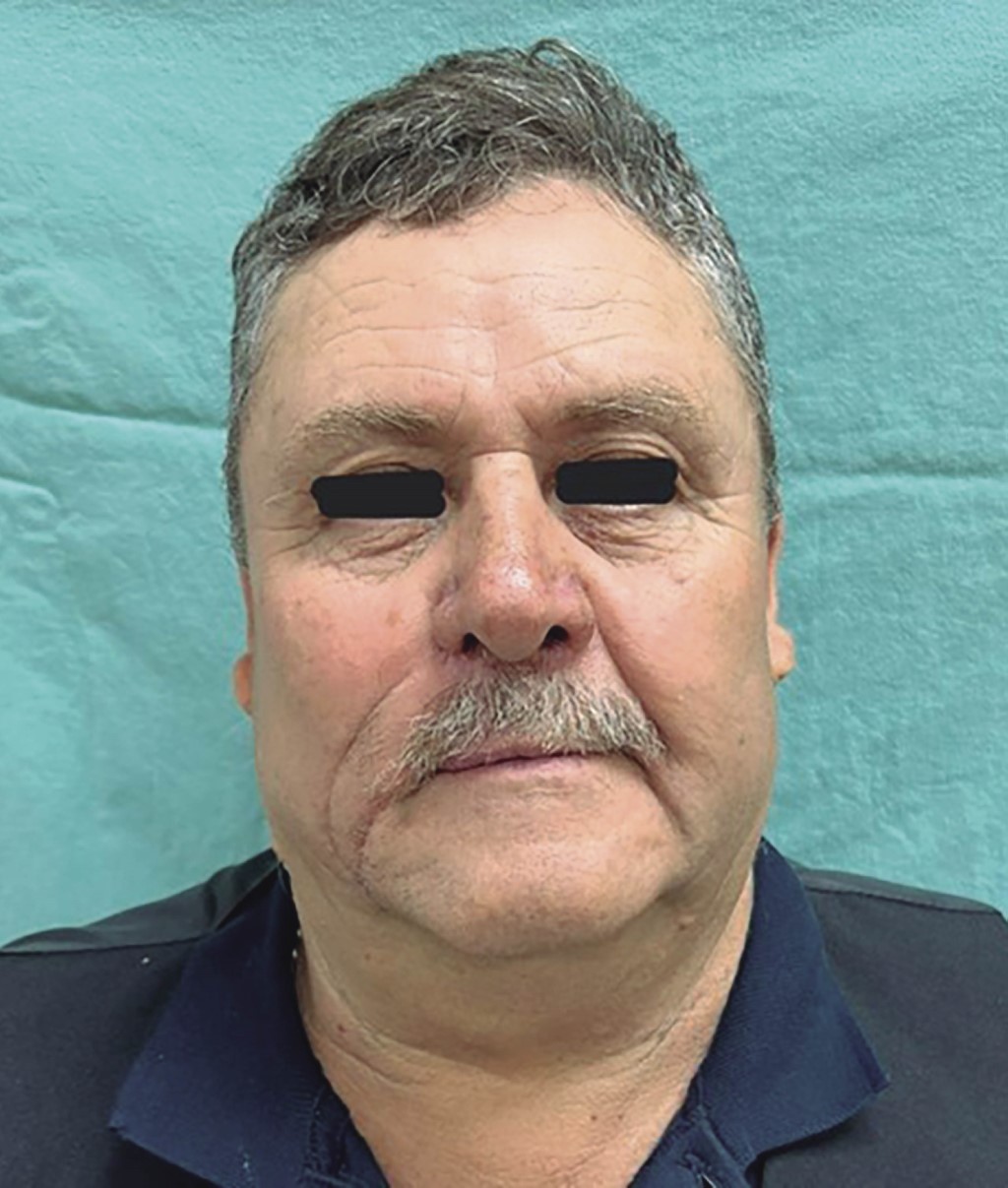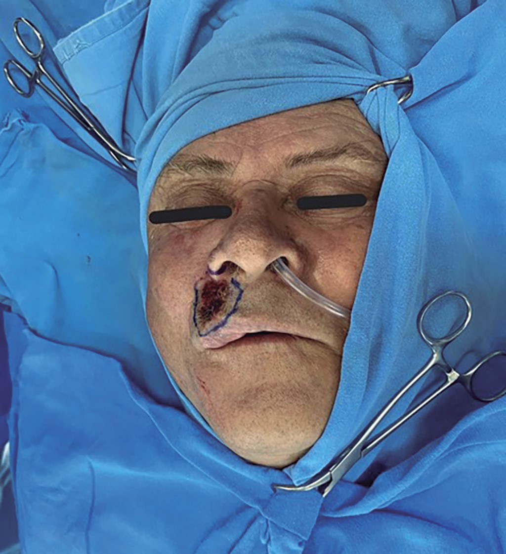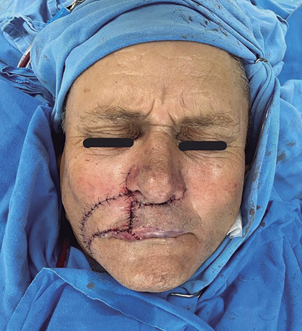 Hombre de 60 años con antecedente de diabetes mellitus tipo II, hipertensión arterial sistémica, insuficiencia cardiaca crónica y consumo crónico de alcohol, cocaína y tabaco. Acudió a nuestra unidad hospitalaria por medio de la consulta externa de primera vez al servicio de cirugía plástica y reconstructiva por tumoración ulcerativa en labio superior derecho de cinco años de evolución. A la exploración física se encontraron los siguientes hallazgos: tumoración de 3 × 2 cm en el labio superior derecho, con ulceración y costra, el resto de la exploración normal. Se inició protocolo quirúrgico con plan de resección de la tumoración más colgajo de avance. Al contar con protocolo quirúrgico completo, se programó para cirugía electiva, ingresó por medio de cirugía ambulatoria y se inició el procedimiento quirúrgico previa asepsia y antisepsia; se procedió a realizar marcaje de la lesión (Figura 1), con resección de la tumoración con márgenes de 5 mm sobre el labio y ala nasal derecha; se disecó por planos resección de ala izquierda para compensar márgenes de lesión (Figura 2). Se liberó el pedículo de tejido subcutáneo elástico de sus uniones adiposas medial y lateral con la grasa circundante de la mejilla, al tiempo que se preservaba su suministro vascular derivado de sus uniones profundas. La isla cutánea se dirigió hacia el defecto mediante la colocación de un gancho cutáneo en su borde anterior. Se realizó avance de colgajo sobre pedículo de tejido subcutáneo; se efectuó cierre con Vicryl 5-0 y Nylon 5-0, se colocó gasa estéril y se dio por terminado el procedimiento quirúrgico (Figura 3). Se egresó al paciente y se citó a consulta externa con recomendaciones generales. Se valoró una semana después de la cirugía con evolución favorable. Se retiraron puntos de sutura y se recabó el reporte de histopatología (Figura 4) de carcinoma basocelular metatípico (basoescamoso), con profundidad de la invasión 2.5 mm, nivel anatómico Clark IV, sin invasión linfovascular ni perineural y sin afectación de márgenes periféricos. Se dio seguimiento a un mes del postquirúrgico (Figura 5) y a tres meses (Figura 6), con buena evolución estético-funcional.
